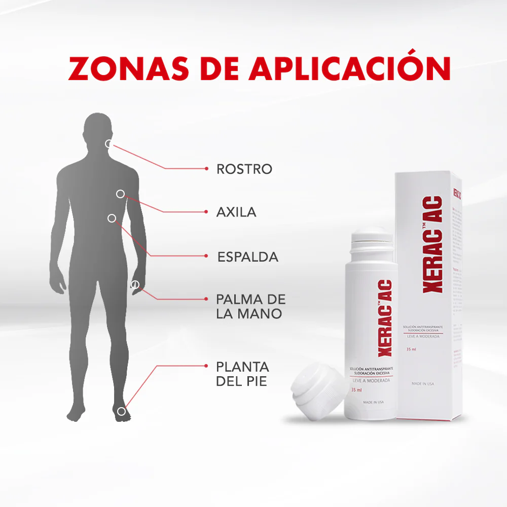 XERAC AC es la Solución Dermatológica Comprobada para el Control de la sudoración moderada a severa en axilas, manos, pies, u otra zona del cuerpo y rostro.