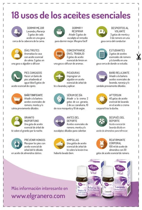 Estos son, en nuestra opinión, las esencias más utilizadas en aroma-terapia y podrás combinarlas con otros aceites conductores como almendras o jojoba. También podrás aplicarlos en tu humidificador para crear un ambiente relajado y agradable. Los aceites esenciales pueden mejorar la calidad del sueño, restaurar la vitalidad, mejorar el estado de ánimo y aliviar el estrés, también purificar el aire interior.