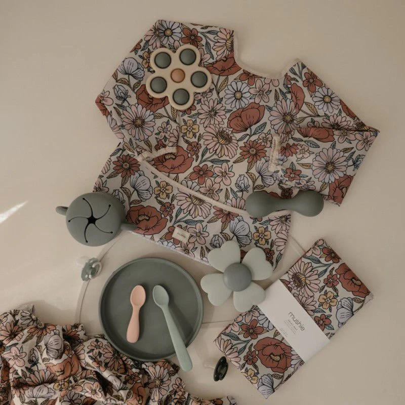 Babero de manga larga Mushie de material resistente al agua. Antimanchas.