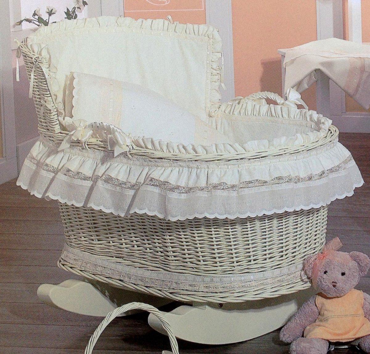 Una obra de artesanía; este moisés balancín de mimbre hecho totalmente a mano. Desde la estructura a las vestiduras todo es una obra de arte que usará tu bebé y pasará de generación en generación.