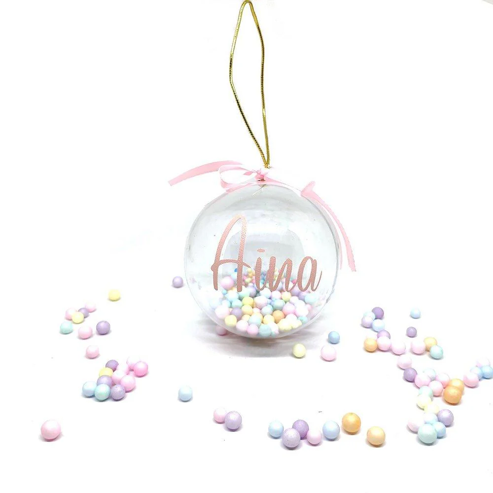 Bola de Navidad Personalizada Transparente rellena de divertidas bolitas de colores y con el nombre que tú pidas. Precio por unidad