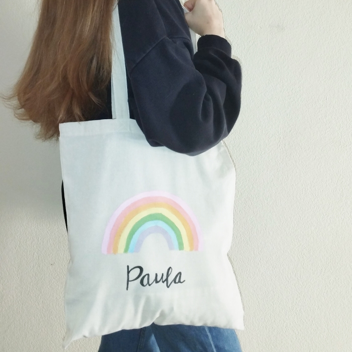 Bolsa de tela de algodón con asas pintada a mano. La pintura es textil por lo que se puede lavar sin problema. Con dos asas para su cómodo transporte. Las medidas son 35×38 cm. El tejido es resistente para poder transportar peso sin problema!