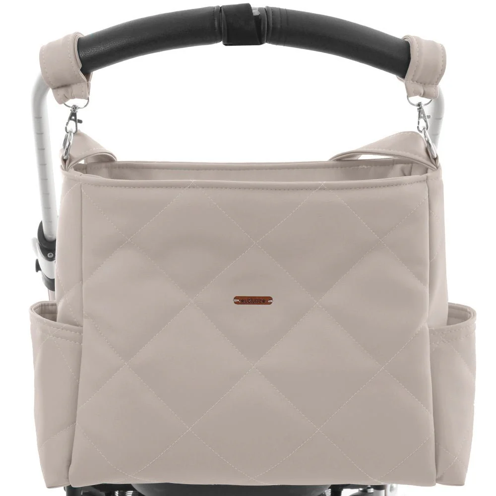 Se puede llevar colgado al hombro o colgar del carrito del bebé. Con bolsillos interiores y exteriores para facilitar el orden.