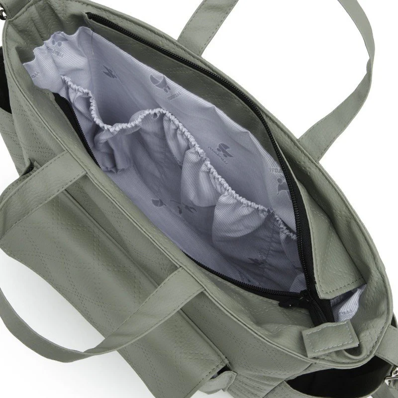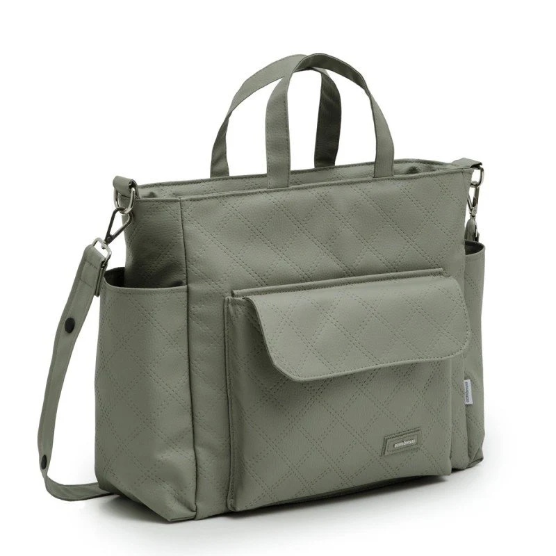 Se puede llevar colgado al hombro o colgar del carrito del bebé. Con bolsillos interiores y exteriores para facilitar el orden.