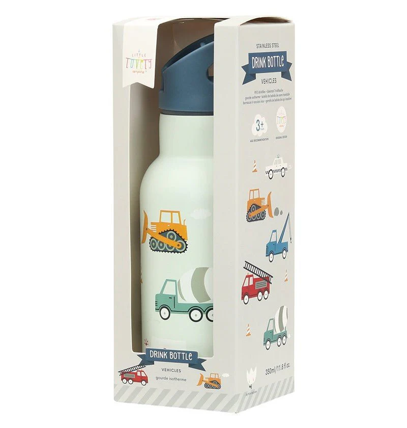 Esta botella infantil de 350 ml en acero, con diseño de vehículos, es perfecta para acompañar a los más pequeños en sus aventuras diarias. Resistente y fácil de usar, mantiene sus bebidas frescas mientras ellos disfrutan de sus héroes sobre ruedas. ¡Hidratarse nunca fue tan divertido!