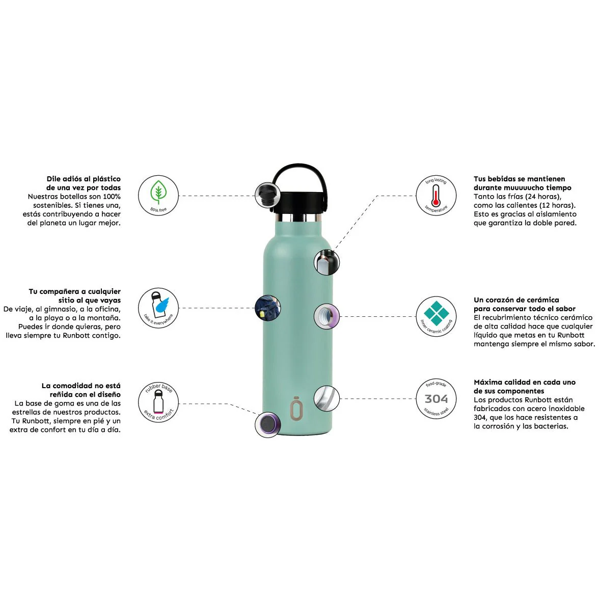 - La botella RUNBOTT está fabricada con doble pared de acero inoxidable con un aislamiento de vacío intermedio. Lo que consigue mantener tu bebida fría hasta 24 horas. Y caliente hasta 12 horas. Sin exagerar, es la única capaz de hacerlo.