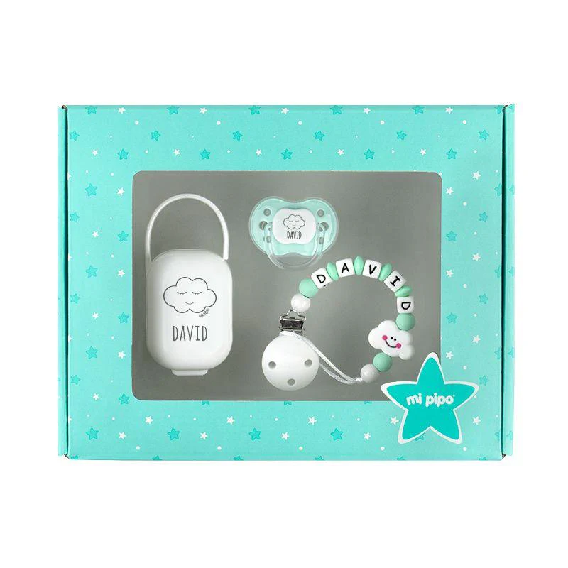Incluye 1 chupete, 1 chupetero silicona personalizado y cajita portachupetes. Máximo 9 caracteres.
