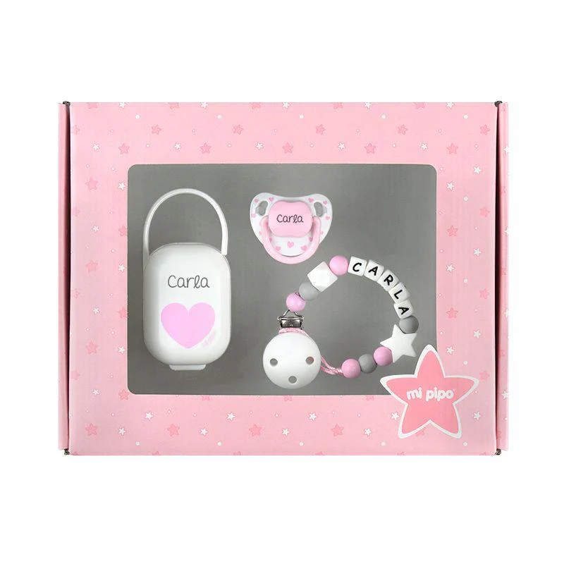 Incluye 1 chupete, 1 chupetero silicona personalizado y cajita portachupetes. Máximo 9 caracteres.