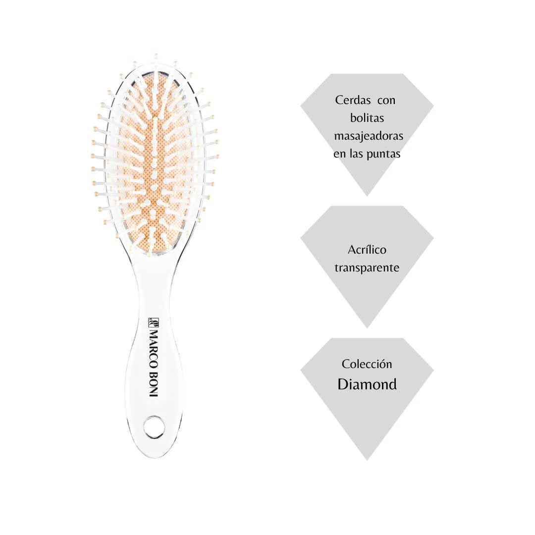 El Cepillo Diamond Oval Marco Boni está pensado para uso diario: su cuerpo en acrílico transparente y las cerdas de nylon con puntas redondeadas/bolitas desenredan con suavidad, masajean el cuero cabelludo y ayudan a evitar quiebre y frizz.