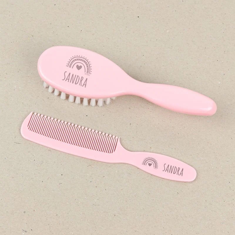 El nombre del bebé se graba en el mango del peine y la trasera del cepillo. El grabado es 100 atóxico por termoimpresión, no contiene tintas.