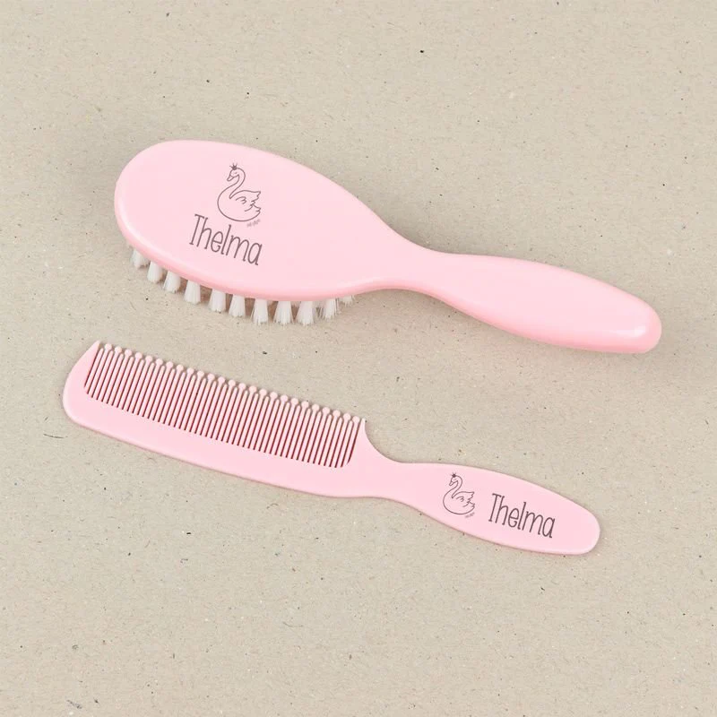 El nombre del bebé se graba en el mango del peine y la trasera del cepillo. El grabado es 100 atóxico por termoimpresión, no contiene tintas.