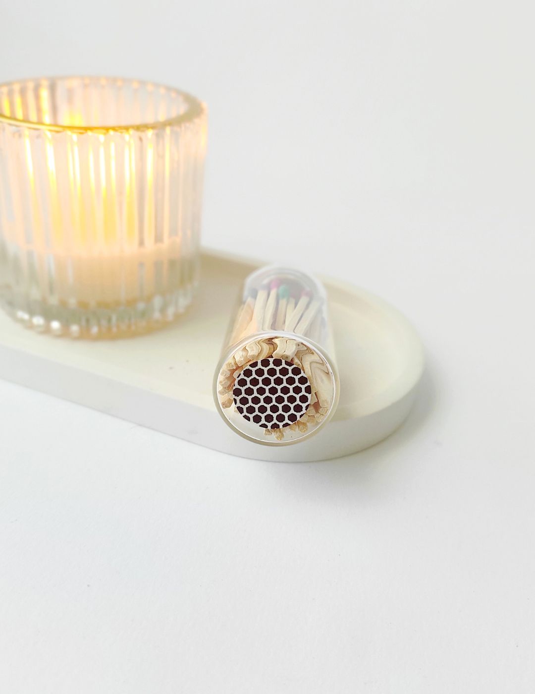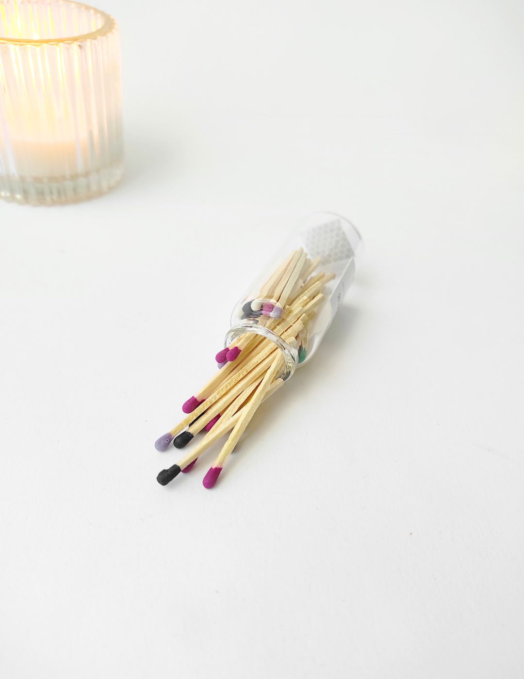 Encender una vela no tiene por qué ser un gesto rutinario: con este bote de cerillas, cada chispa se convierte en un momento especial. Contiene 50 cerillas de madera de 4,5 cm con puntas de colores vibrantes, guardadas en un elegante tarro de cristal con tapa de corcho y superficie de encendido integrada. Un diseño minimalista y encantador que luce igual de bien en una mesa, una estantería o junto a tu rincón favorito.