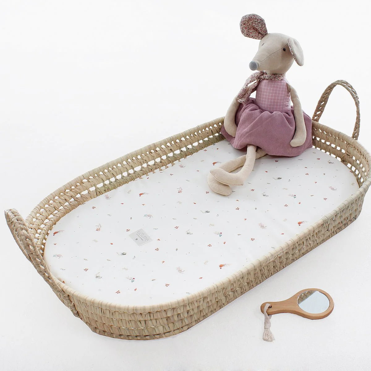Cesto de palma con colchón impermeable y bajera ajustable incluida. Para colocar encima de cualquier cómoda.