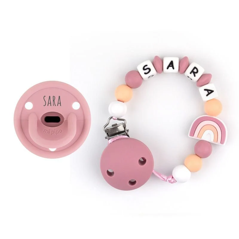 Chupetero cadenita silicona personalizado con el nombre, original, y confeccionado con materiales de fabricación alemana, de primera calidad, NO toxicos para el bebé. A pesar de eso es muy importante recordar que el chupetero no es un juguete ni un mordedor, no hay que dejar que el bebé lo chupe o lo muerda.