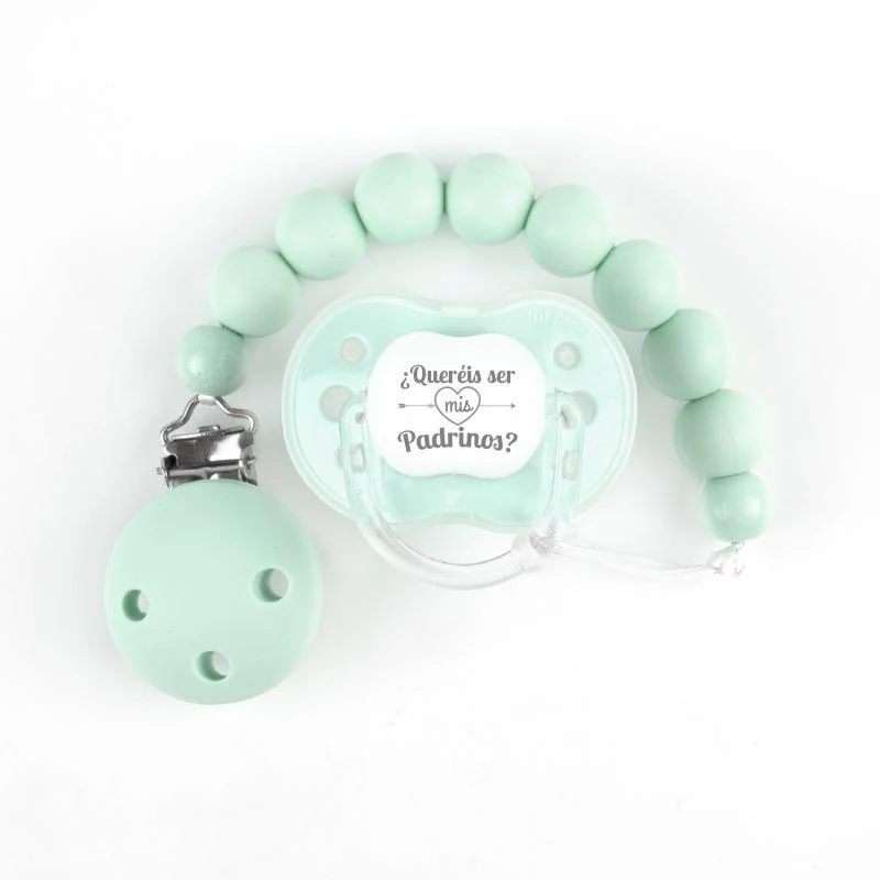 Chupetero cadenita silicona personalizado con el nombre, original, y confeccionado con materiales de fabricación alemana, de primera calidad, NO toxicos para el bebé. A pesar de eso es muy importante recordar que el chupetero no es un juguete ni un mordedor, no hay que dejar que el bebé lo chupe o lo muerda.