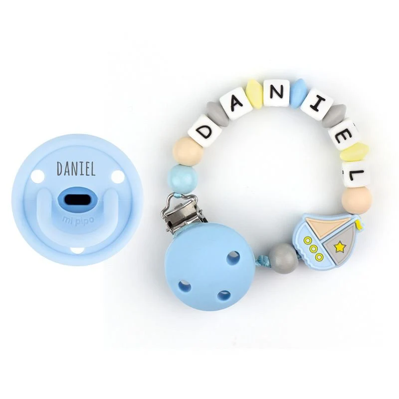 Chupetero cadenita silicona personalizado con el nombre, original, y confeccionado con materiales de fabricación alemana, de primera calidad, NO toxicos para el bebé. A pesar de eso es muy importante recordar que el chupetero no es un juguete ni un mordedor, no hay que dejar que el bebé lo chupe o lo muerda.