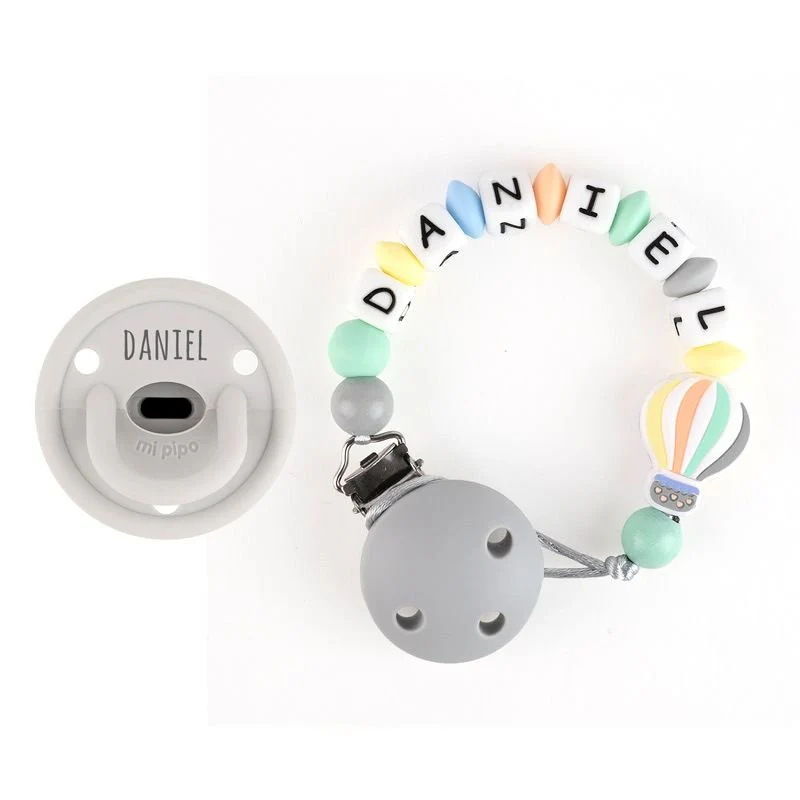 Chupetero cadenita silicona personalizado con el nombre, original, y confeccionado con materiales de fabricación alemana, de primera calidad, NO toxicos para el bebé. A pesar de eso es muy importante recordar que el chupetero no es un juguete ni un mordedor, no hay que dejar que el bebé lo chupe o lo muerda.