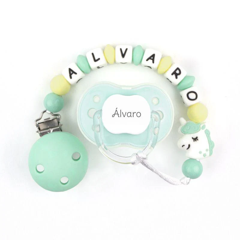 Chupetero cadenita silicona personalizado con el nombre, original, y confeccionado con materiales de fabricación alemana, de primera calidad, NO toxicos para el bebé. A pesar de eso es muy importante recordar que el chupetero no es un juguete ni un mordedor, no hay que dejar que el bebé lo chupe o lo muerda.