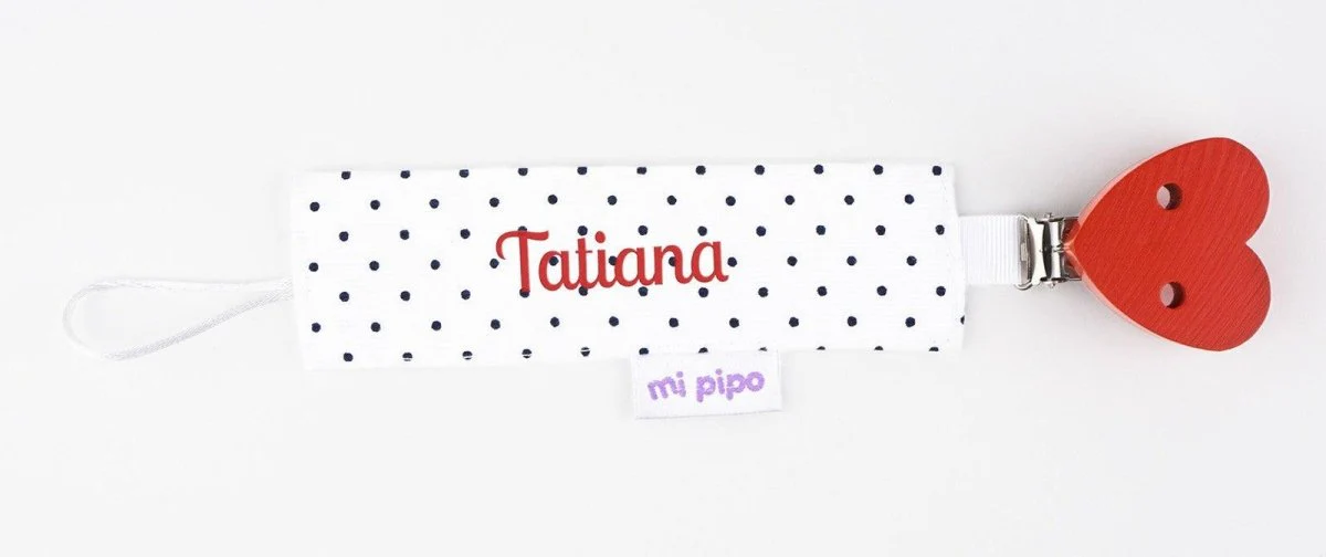 Broche de tela y madera para sujetar el chupete personalizado con el nombre.