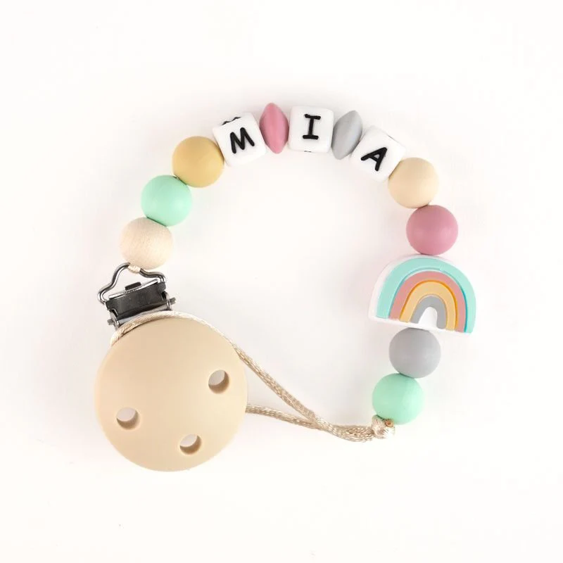 Chupetero cadenita silicona personalizado con el nombre, original, y confeccionado con materiales de fabricación alemana, de primera calidad, NO toxicos para el bebé. A pesar de eso es muy importante recordar que el chupetero no es un juguete ni un mordedor, no hay que dejar que el bebé lo chupe o lo muerda.