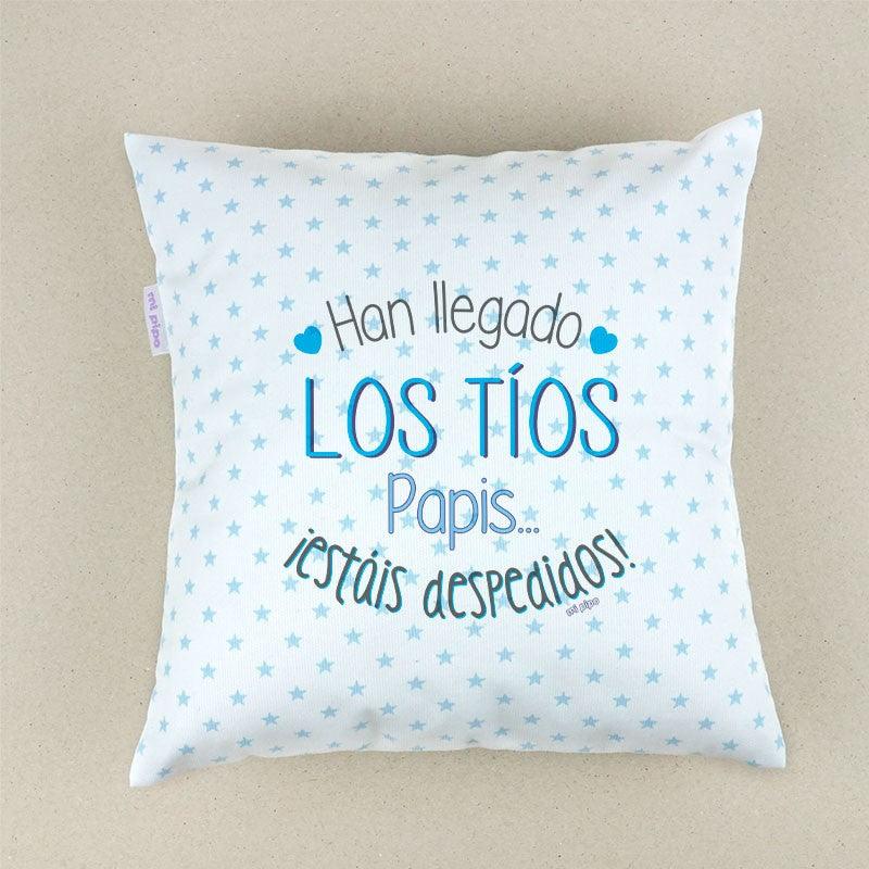 Cojín decorativo ideal para el dormitorio infantil o el dormitorio de bebé. Cojín «Ha llegado los tios, papis estáis despedidos».