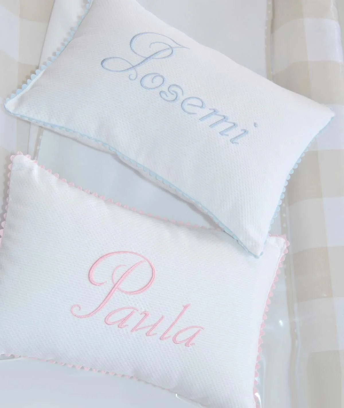 Preciosos cojines bordados con el nombre del bebé.