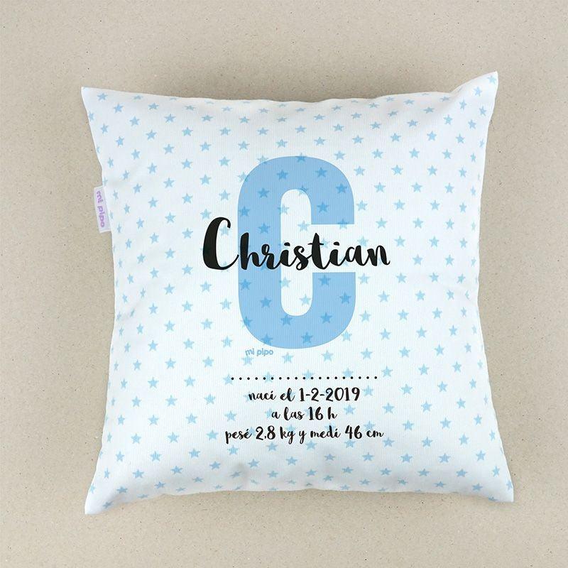 Cojín Personalizado Datos Nacimiento Bebé Mi Pipo Inicial Azul estrellas