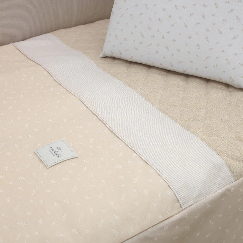 Colcha de cuna que se puede utilizar durante todo el año. Y el protector evita que el bebé se pueda dar un golpe en los barrotes o colar las piernas en los huecos.