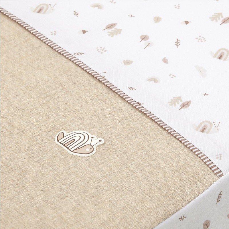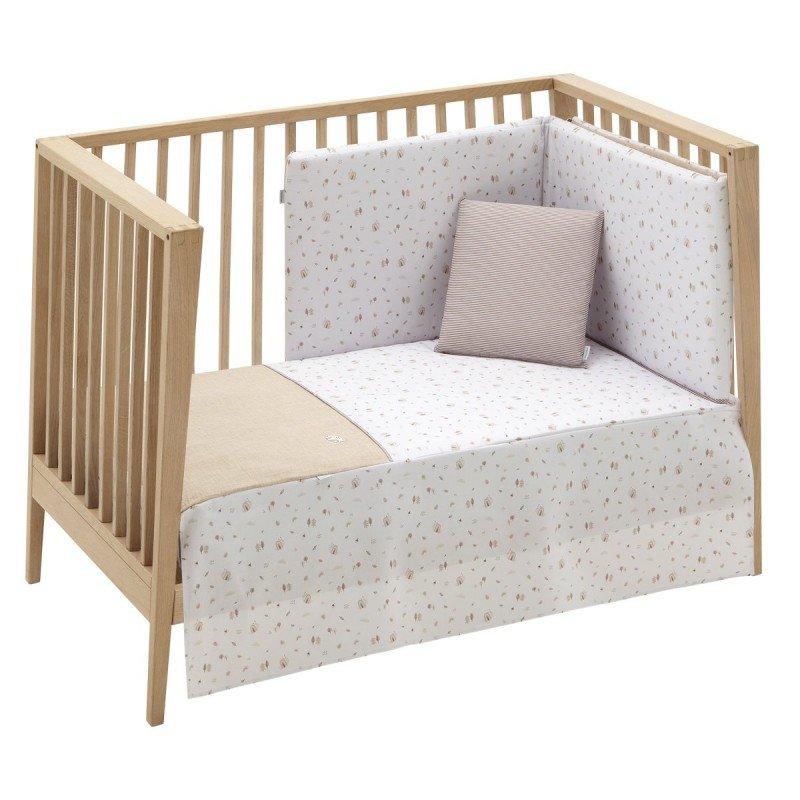 Colcha de cuna que se puede utilizar durante todo el año. Y el protector evita que el bebé se pueda dar un golpe en los barrotes o colar las piernas en los huecos.