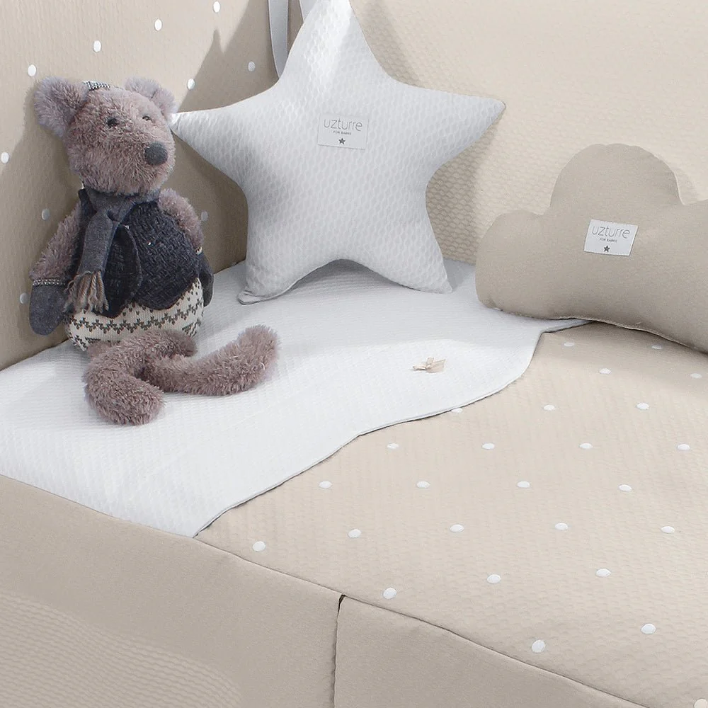 Transforma la cuna en un espacio acogedor y seguro con esta colcha y protector diseñados especialmente para bebés. Confeccionados con vestiduras clásicas adornadas con delicados topos bordados, combinan estilo tradicional con funcionalidad práctica. El protector protege a tu pequeño de golpes mientras duerme, mientras que la colcha proporciona calidez y confort. Perfectos para crear un ambiente tierno y protegido donde tu bebé descanse tranquilo. Detalles cuidados que reflejan el amor por los más pequeños.