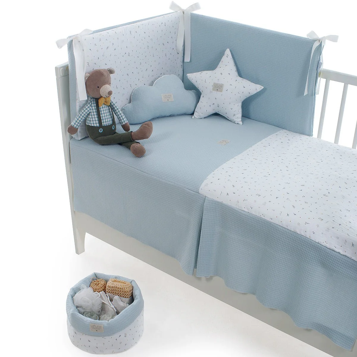 La colcha para cuna y protector barrotes cuna alegrarán la cuna del bebé con la mejor calidad de confección, acabados impecables y los mejores tejidos para respetar la delicada piel del bebé.
