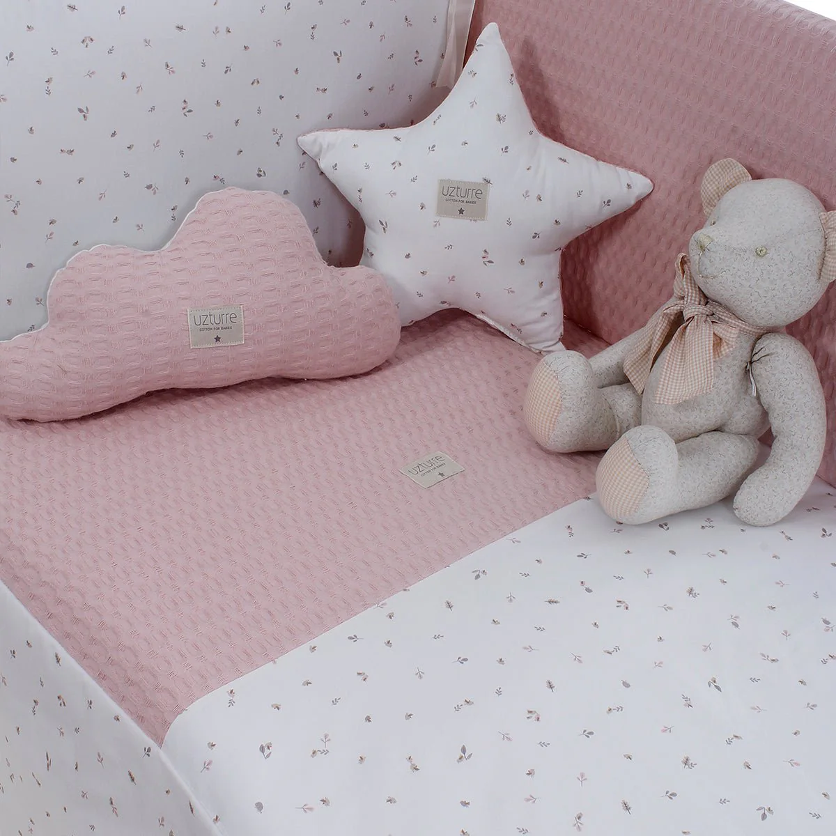 Pack de colcha + Chichonera protector para cunas. Los cojines y peluche no van incluidos en el precio. Se venden aparte.