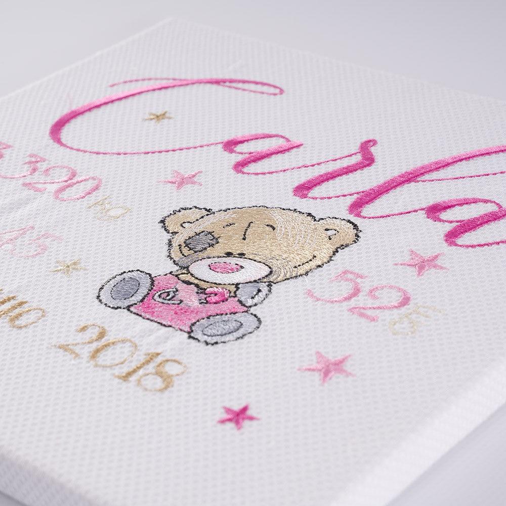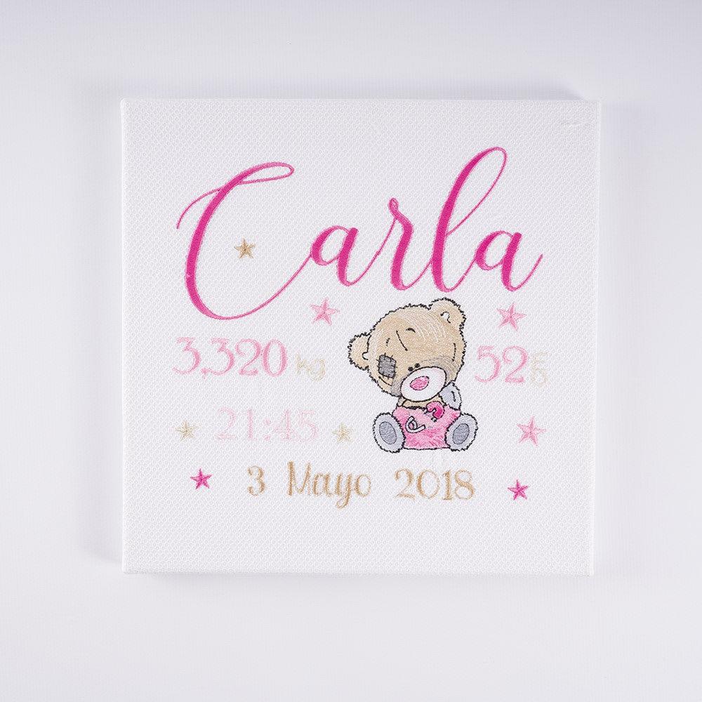 Precioso cuadro en lienzo bordado personalizado con los datos de nacimiento del bebé.