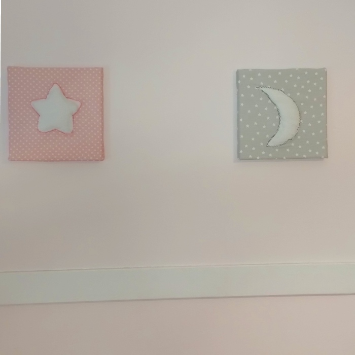 Cuadro para decoración de habitación infantil. Elaborado de tela sobre bastidor de 20×20. Imagen de una luna en relieve. La tela del fondo es personalizable entre nuestros modelos.