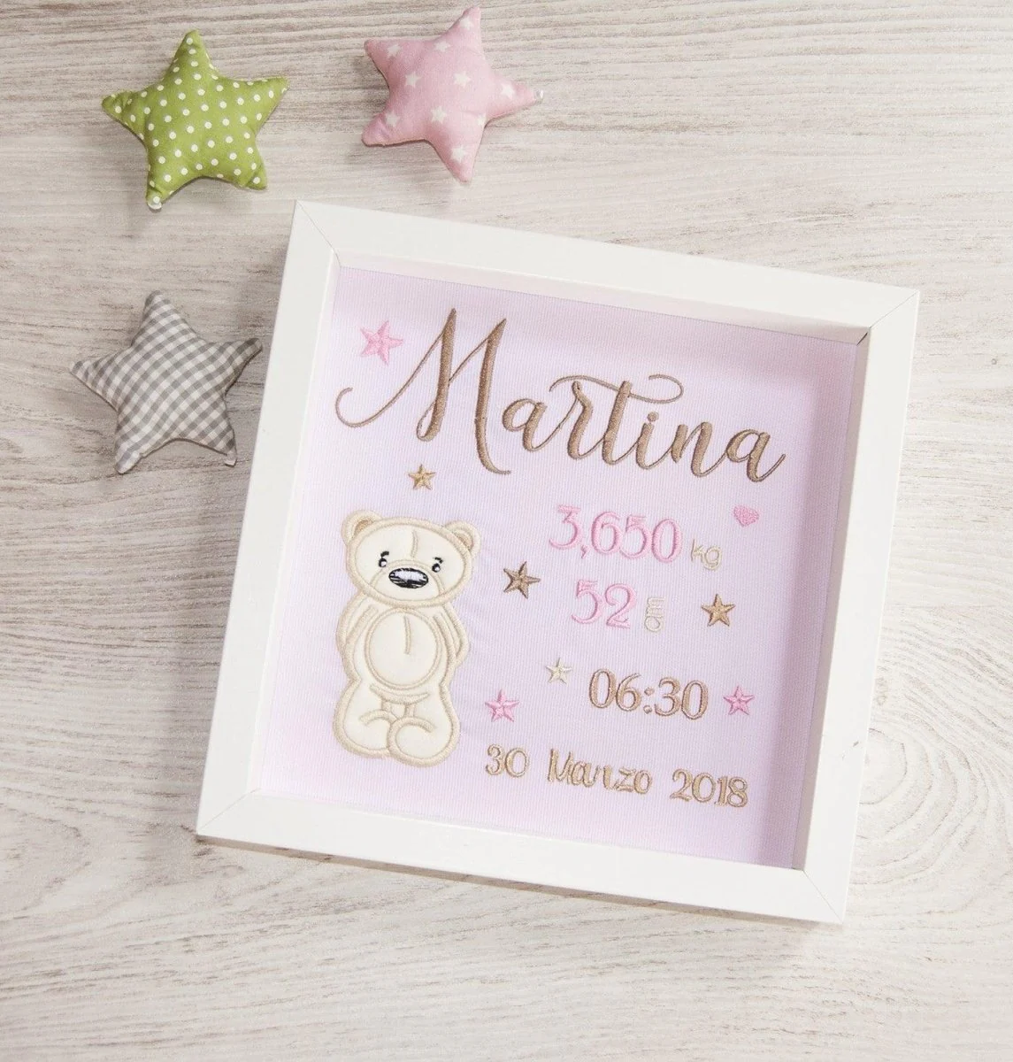 Preciosos cuadros nacimiento bordado personalizado con los datos de nacimiento del bebé.