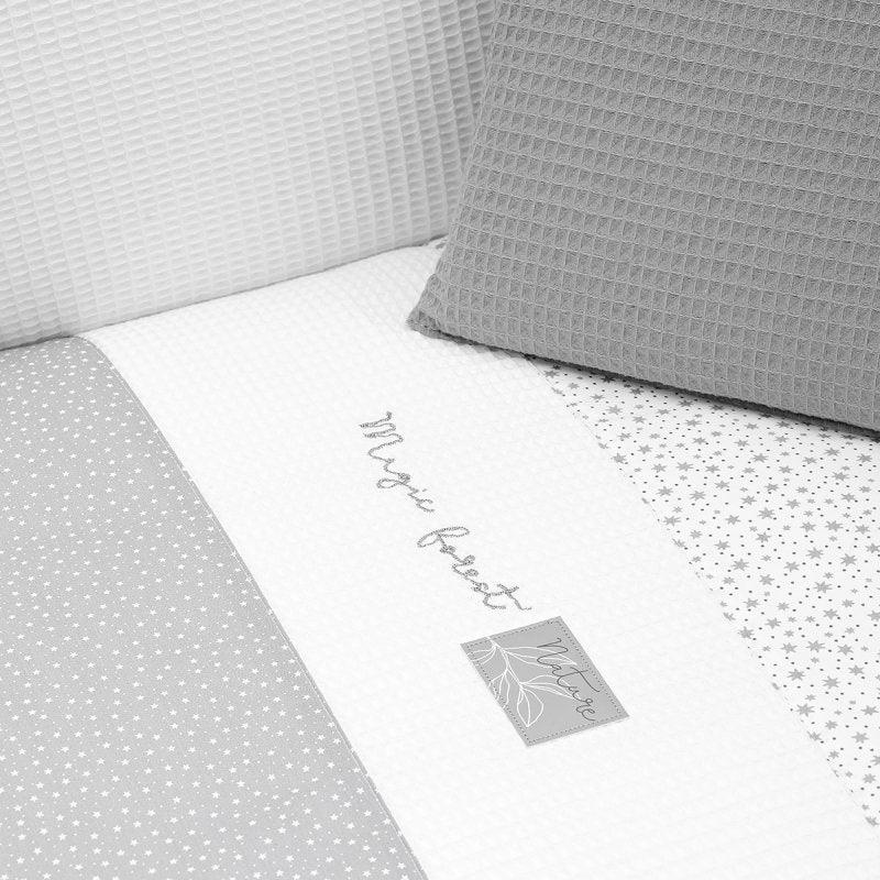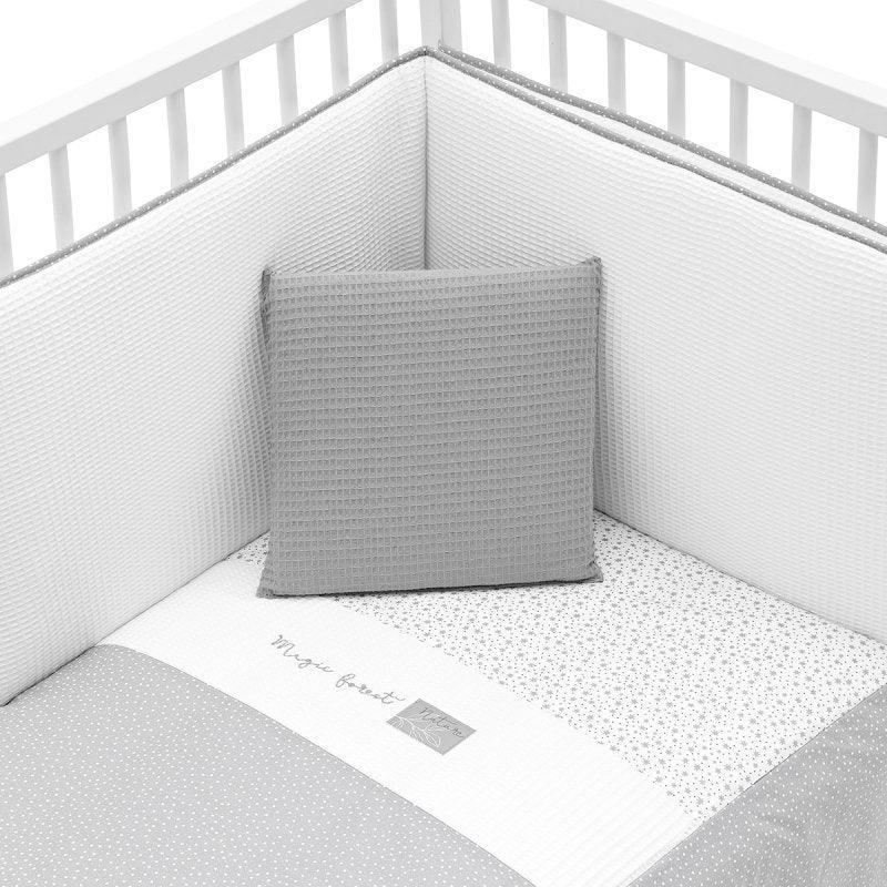 Cuna con protector Forest Gris Cambrass ofrece una solución práctica para vestir la cuna del bebé. Hecho de materiales suaves y duraderos para la comodidad y seguridad del recién nacido, también es ideal para la maternidad. Diseñado con cuidado para coordinarse con tu espacio de dormitorio.