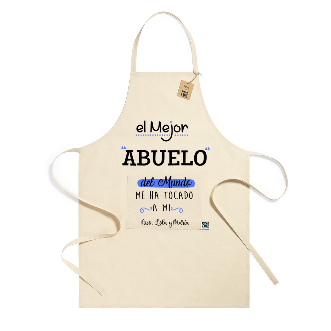 El regalo perfecto para el mejor abuelo. Esta practico Delantal está fabricado en Algodon 100% de 180g/m2 en tono natura de alta calidad y cuenta con untamaño de 65 x 90 x cm aproximado, para que presuma de ser un auténtico chef con tu propio delantal personalizado