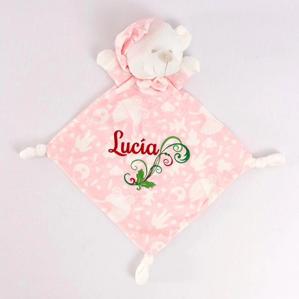 Dou dou personalizado de navidad para bebé con su nombre bordado. Un simpático doudou con cabeza de oso y tejido estampado.