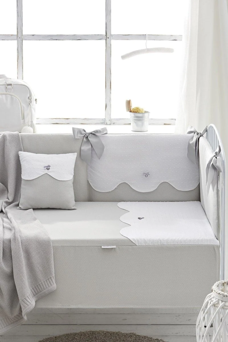 Edredón Cuna y chichonera de cuna. El cojín se vende aparte. Esta colcha de cuna Toscana Gris de Bimbi Class es elegante y clásica combinando tela de piqué gris con tela de plumeti blanco.