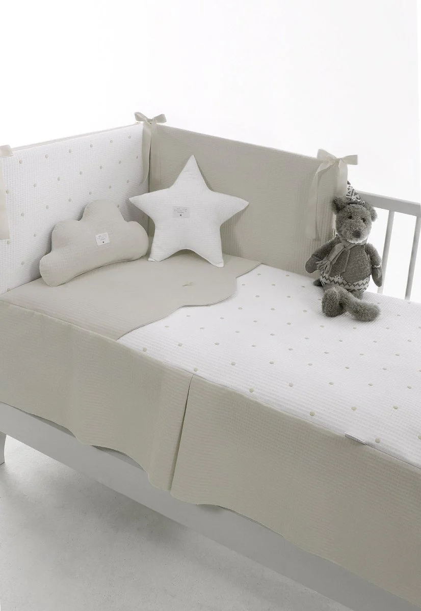 La colcha para cuna y protector barrotes cuna alegrarán la cuna del bebé con la mejor calidad de confección, acabados impecables y los mejores tejidos para respetar la delicada piel del bebé.