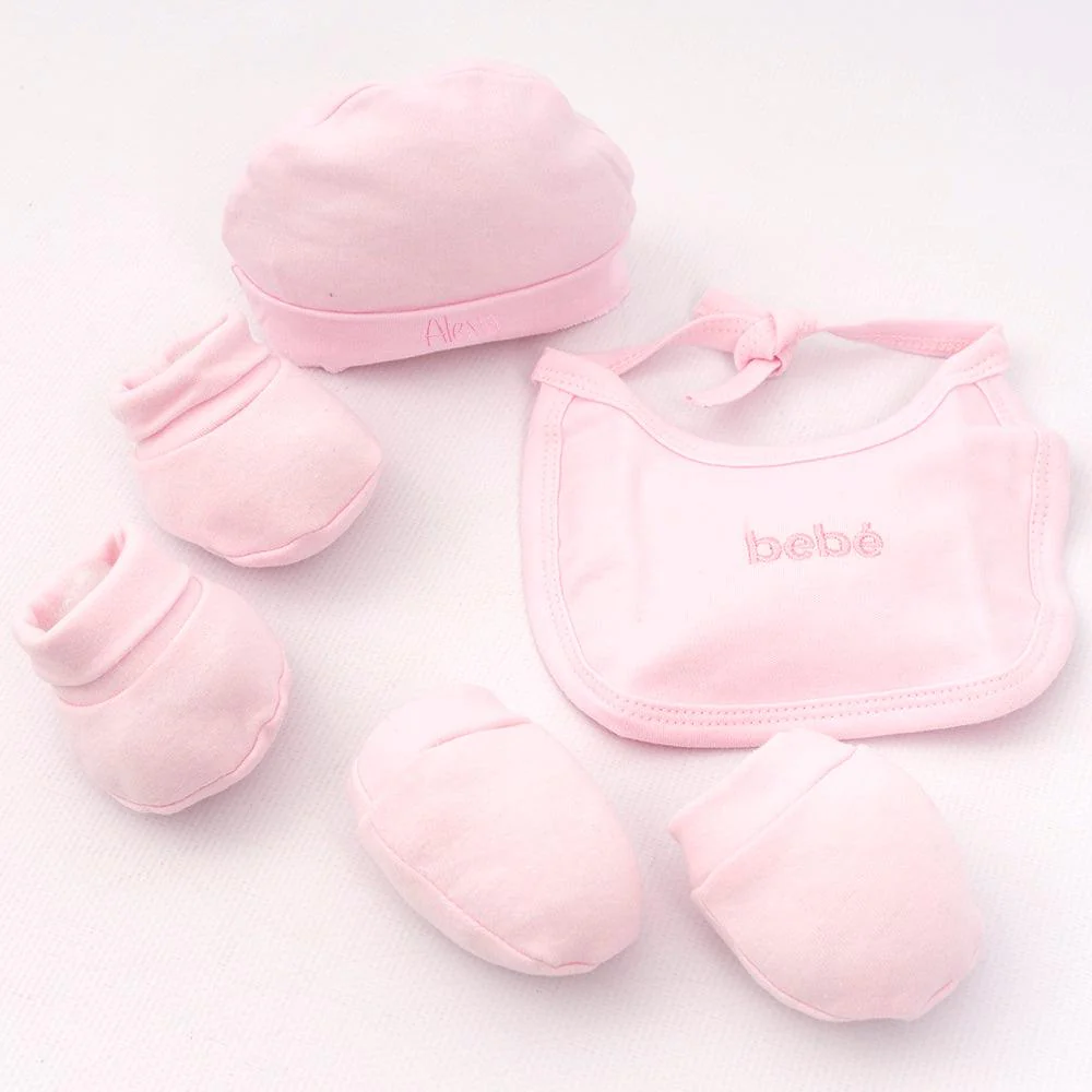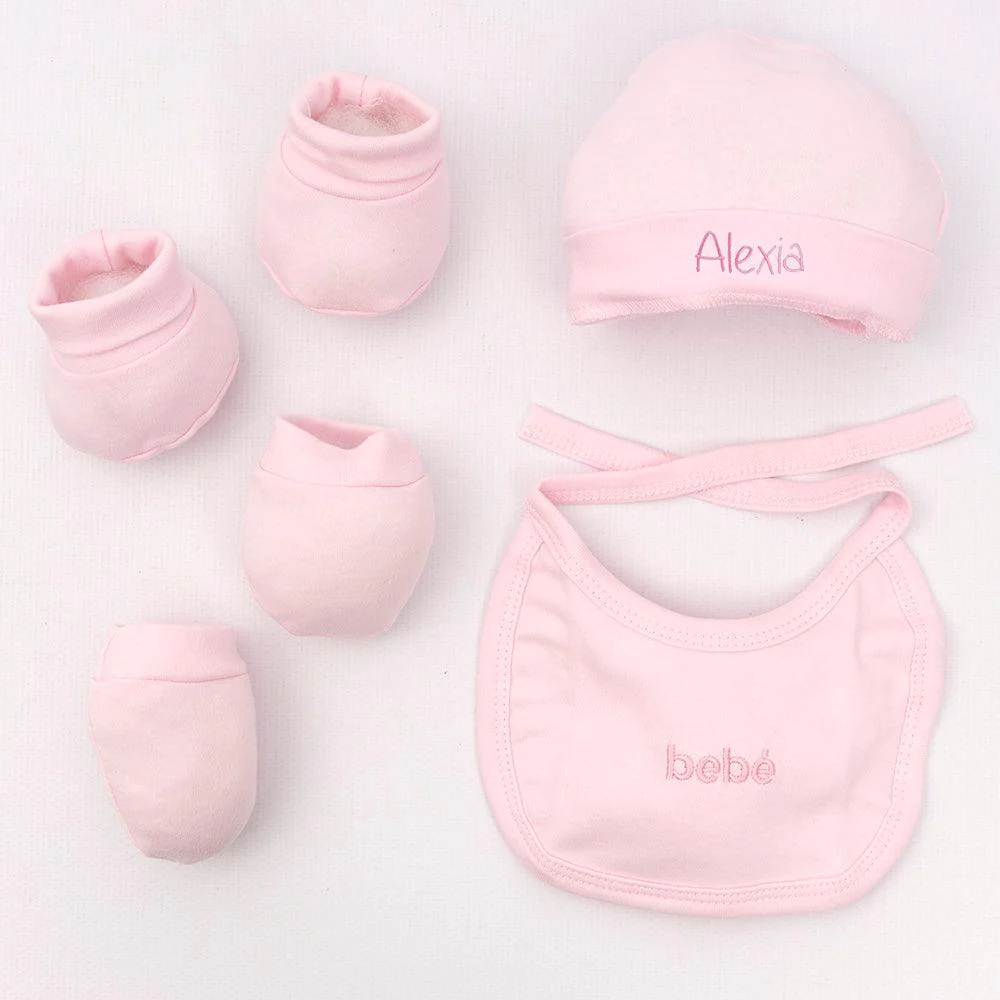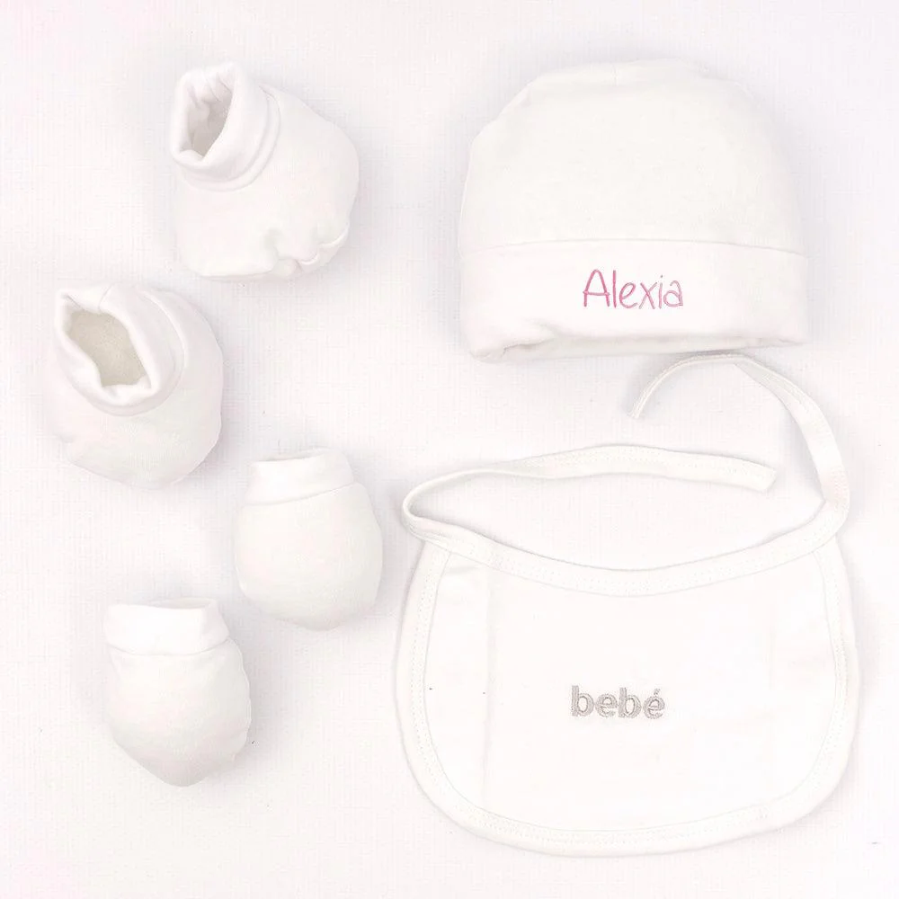 La primera puesta del paritorio para un recién nacido tiene que llevar gorrito, babero, manoplas y peucos de algodón. Pack de primera puesta para el paritorio personalizado con le nombre del bebé bordado