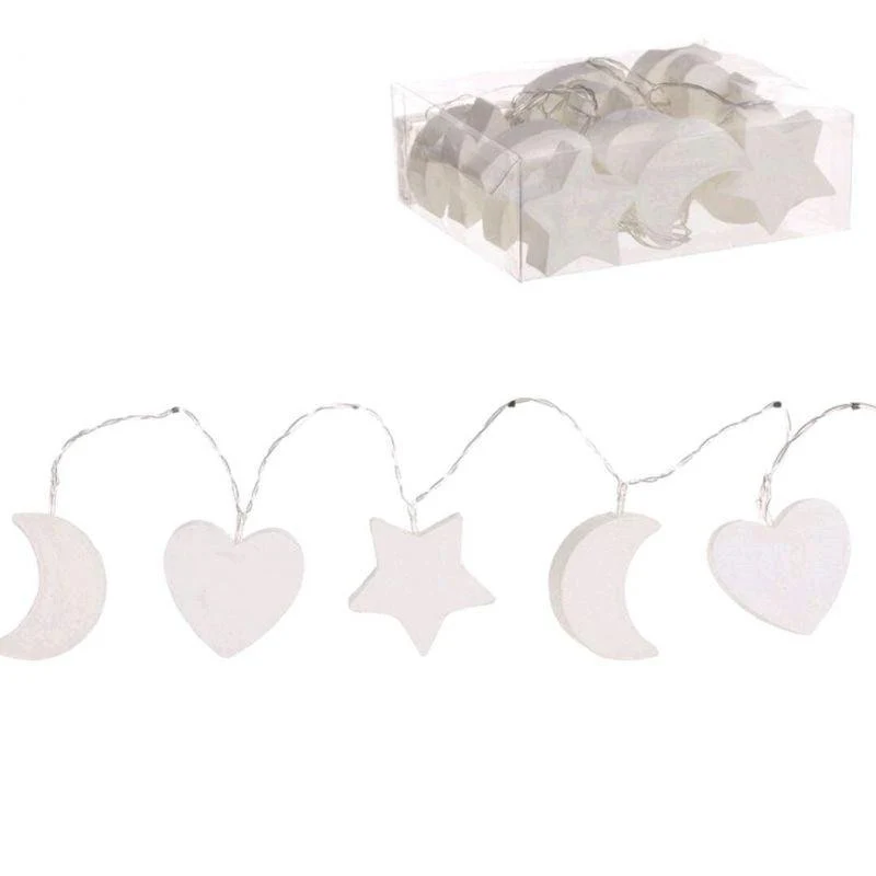 – Una guirnalda con estrellas y lunas en tono blancos; Perfecta para decorar iluminando o dejar una luz sutil al bebé por la noche