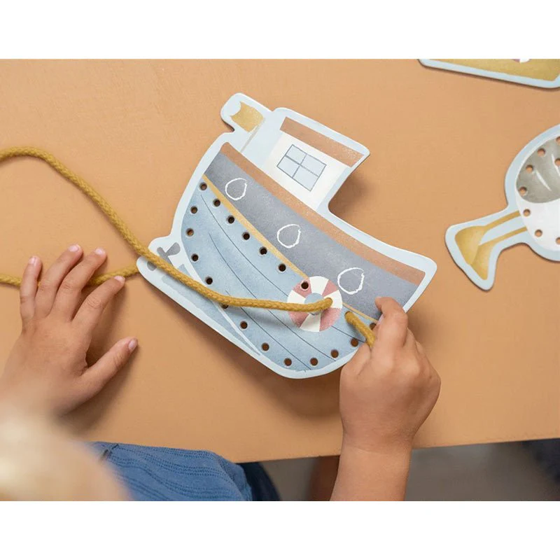 Tarjetas de madera con temática marinera diseñadas para enhebrar cordones. Estimula la concentración y refuerza la motricidad fina mientras los niños crean sus propios patrones. Ilustraciones cautivadoras que hacen el aprendizaje más entretenido. Juguete versátil que combina diversión con desarrollo cognitivo.
