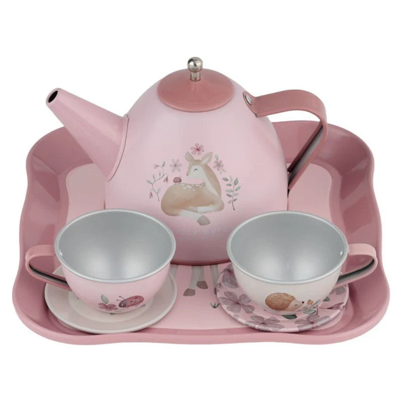 Incluye una tetera, dos tazas, dos platitos, una bandeja y una preciosa cajita.