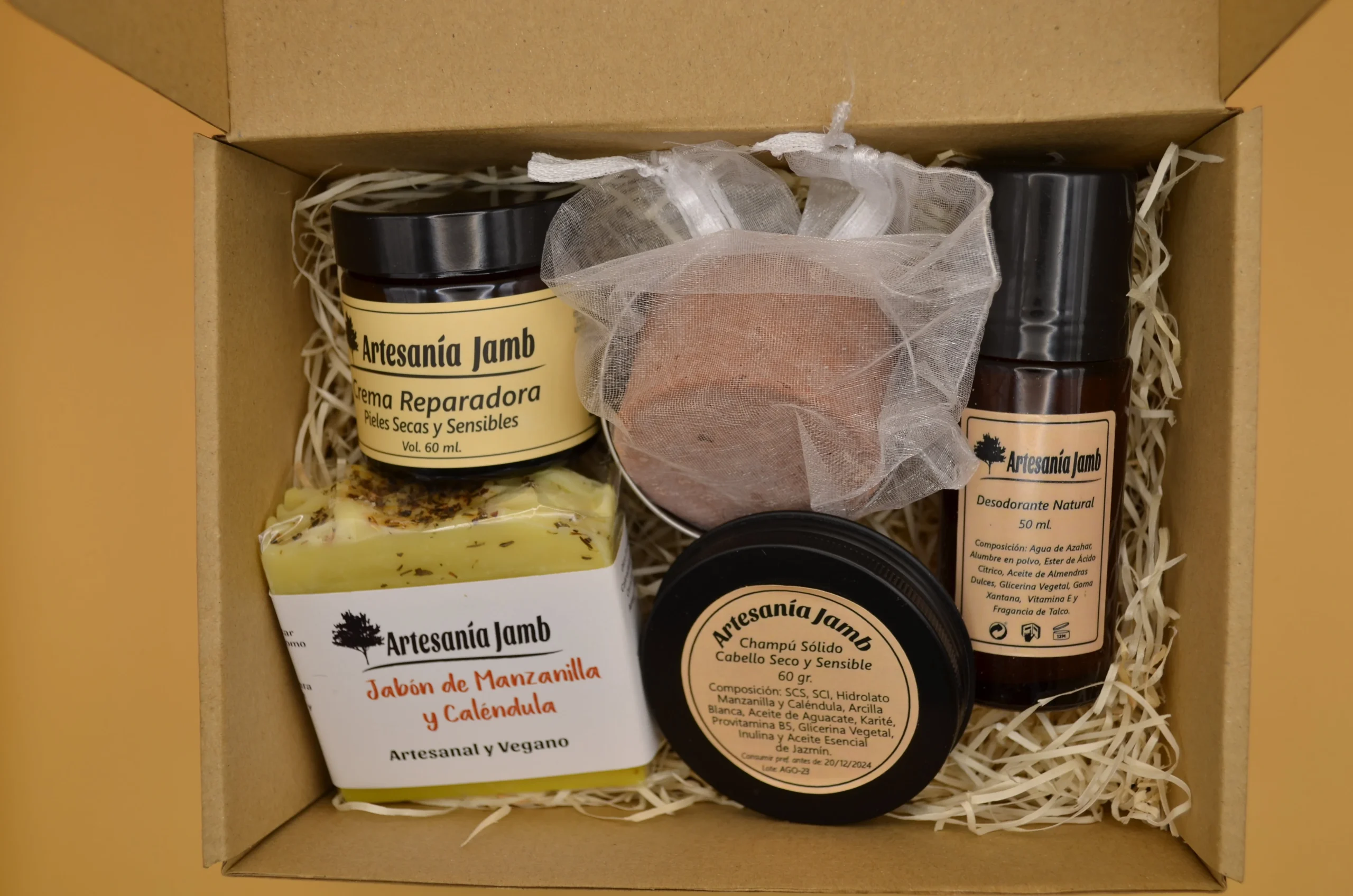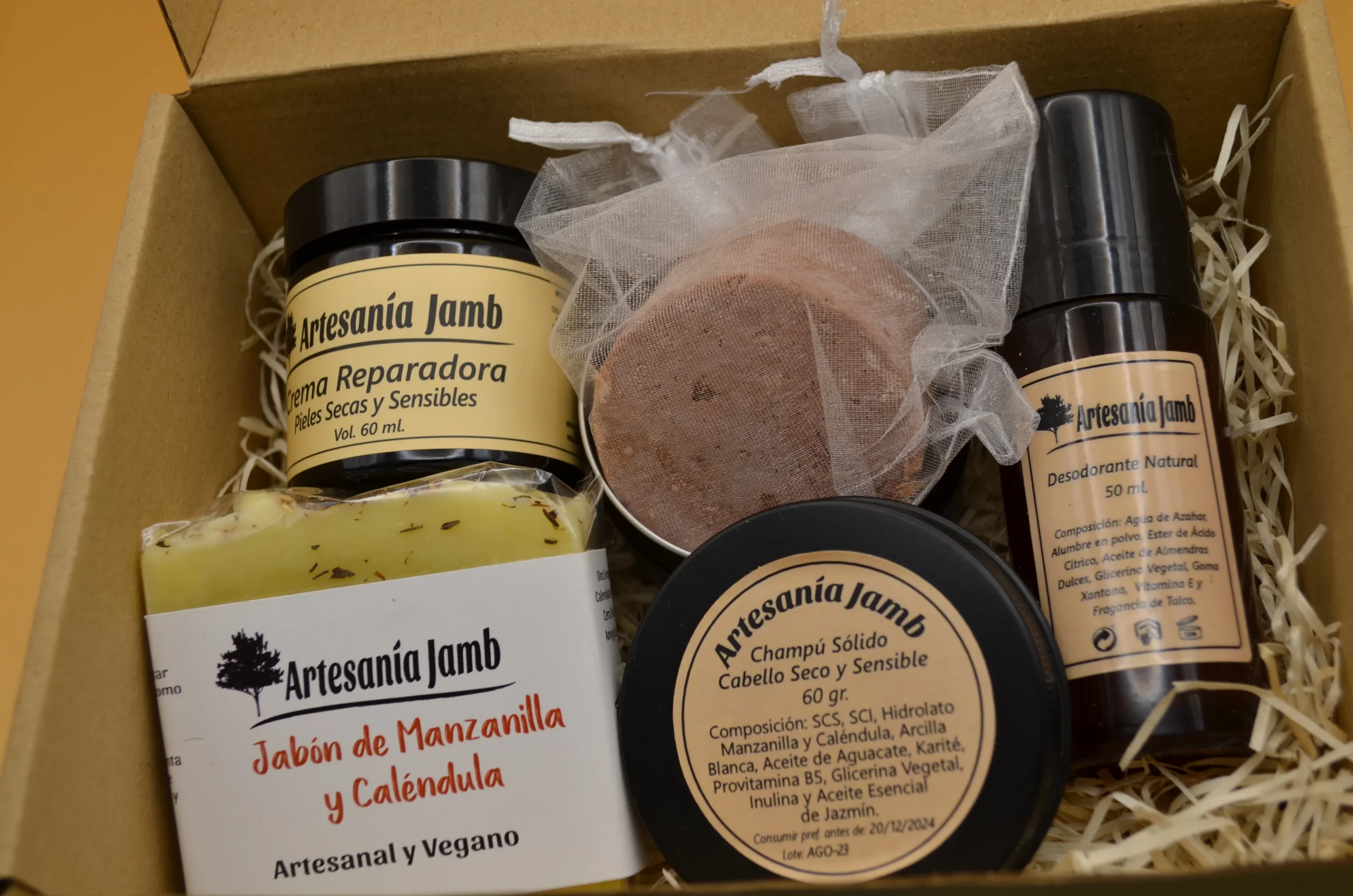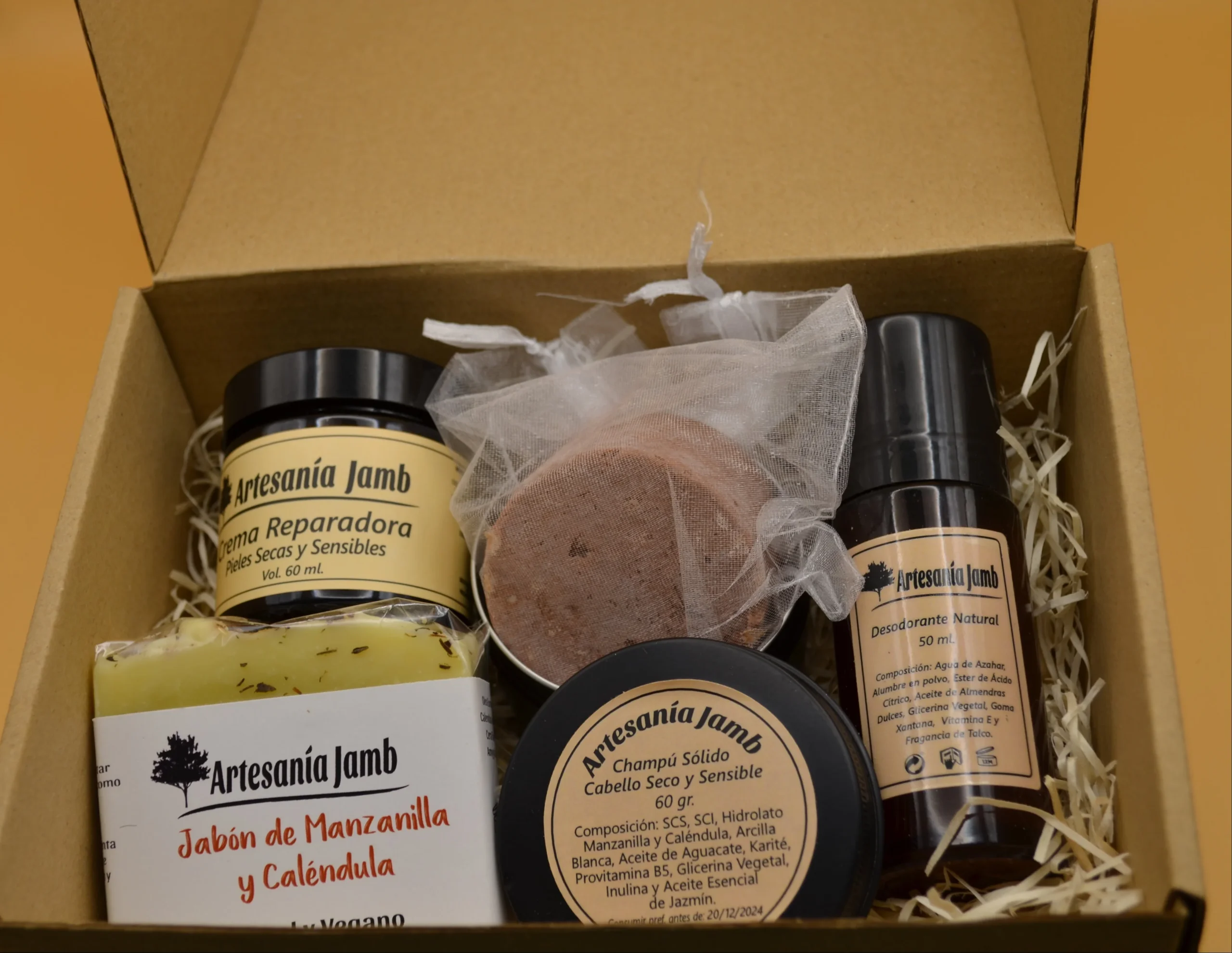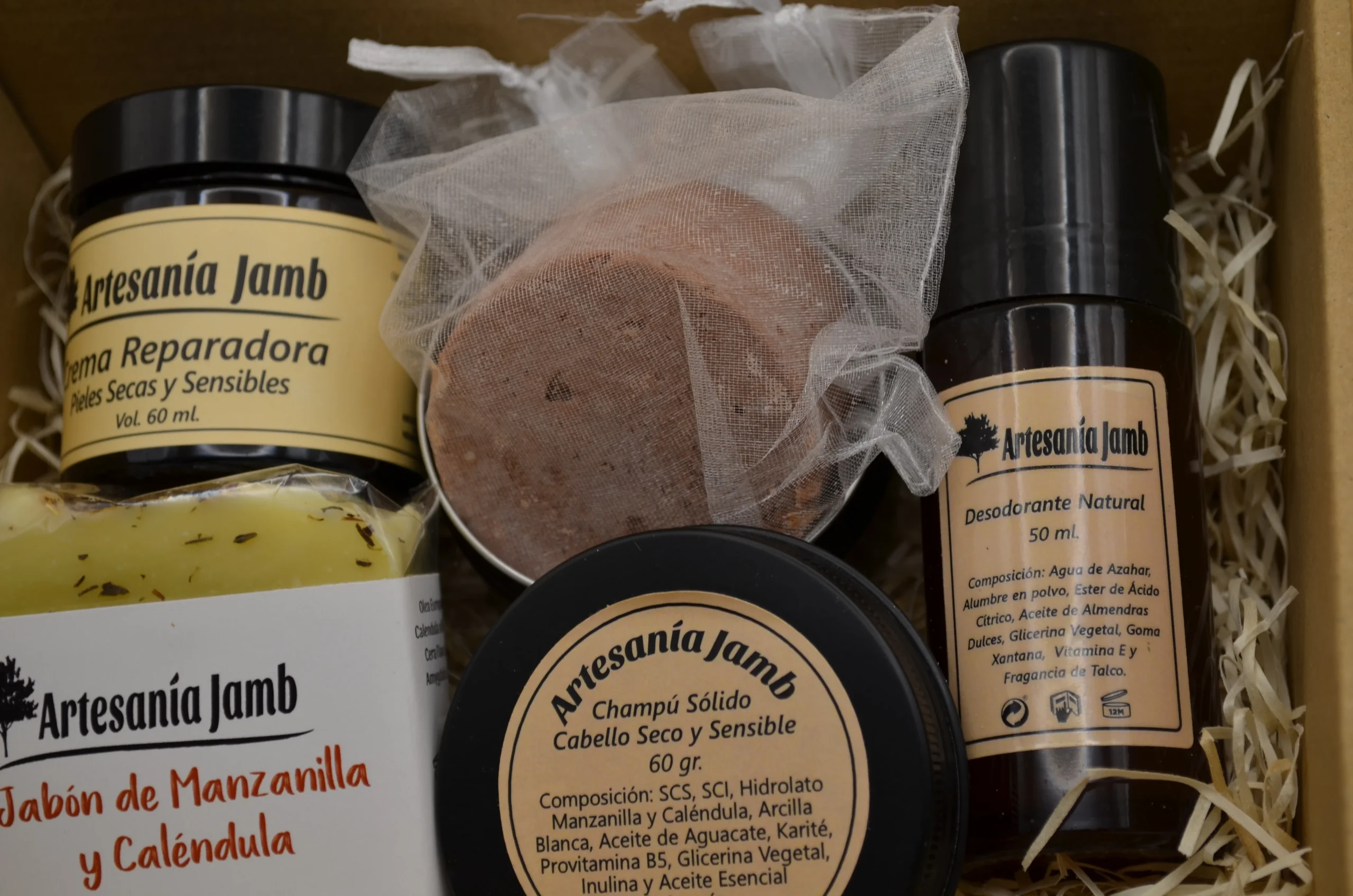 Esta Caja Regalo Piel Sensible está compuesta de los productos más nutritivos e hidratantes de Artesanía Jamb, por lo tanto está diseñada para pieles especialmente secas, sensibles y para tratar desajustes dérmicos relacionados con la escasez de humedad en la piel como dermatitis, psoriasis o eccemas. Se trata de un kit regalo súper completo ya que incluye productos para el cuidado, facial, corporal y capilar siendo todos ellos especialmente nutritivos. En primer lugar, tenemos la Crema Facial Reparadora, que recibe ese nombre por sus numerosos ingredientes calmantes, cicatrizantes y reparadores como el Aceite de Caléndula, Almendras Dulces, Karité, y Extracto de Agastache Mexicana. El Jabón Artesanal de Caléndula y el Desodorante Natural de Talco se convierten en alternativas orgánicas para el cuidado corporal y en especial para pieles irritadas o sensibles, gracias a su combinación de ingredientes reparadores, nutritivos y calmantes como Aceite de Oliva, Coco, Almendras Dulces y Karité. Por último, nuestro Champú Sólido para Cabello Seco y Sensible es un producto imprescindible que no podía faltar en este Kit y que ya se ha convertido en uno de los favoritos de nuestros clientes. Está elaborado con tensioactivos naturales derivados del Aceite de Coco, que tienen una función limpiadora; Arcillas y Aceites vegetales como Aguacate, Glicerina vegetal y Karité, con propiedades nutritivas y reparadoras; y elementos más específicos como Provitamina B5 o Inulina vegetal que aportan firmeza a la raiz y a las fibras capilares pero además actúan como acondicionadores orgánicos del cabello.