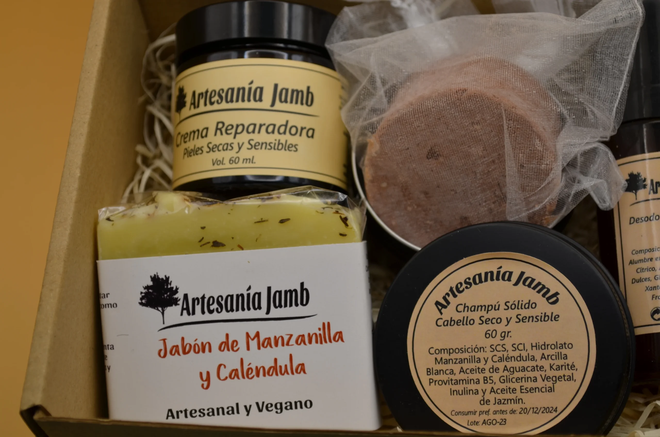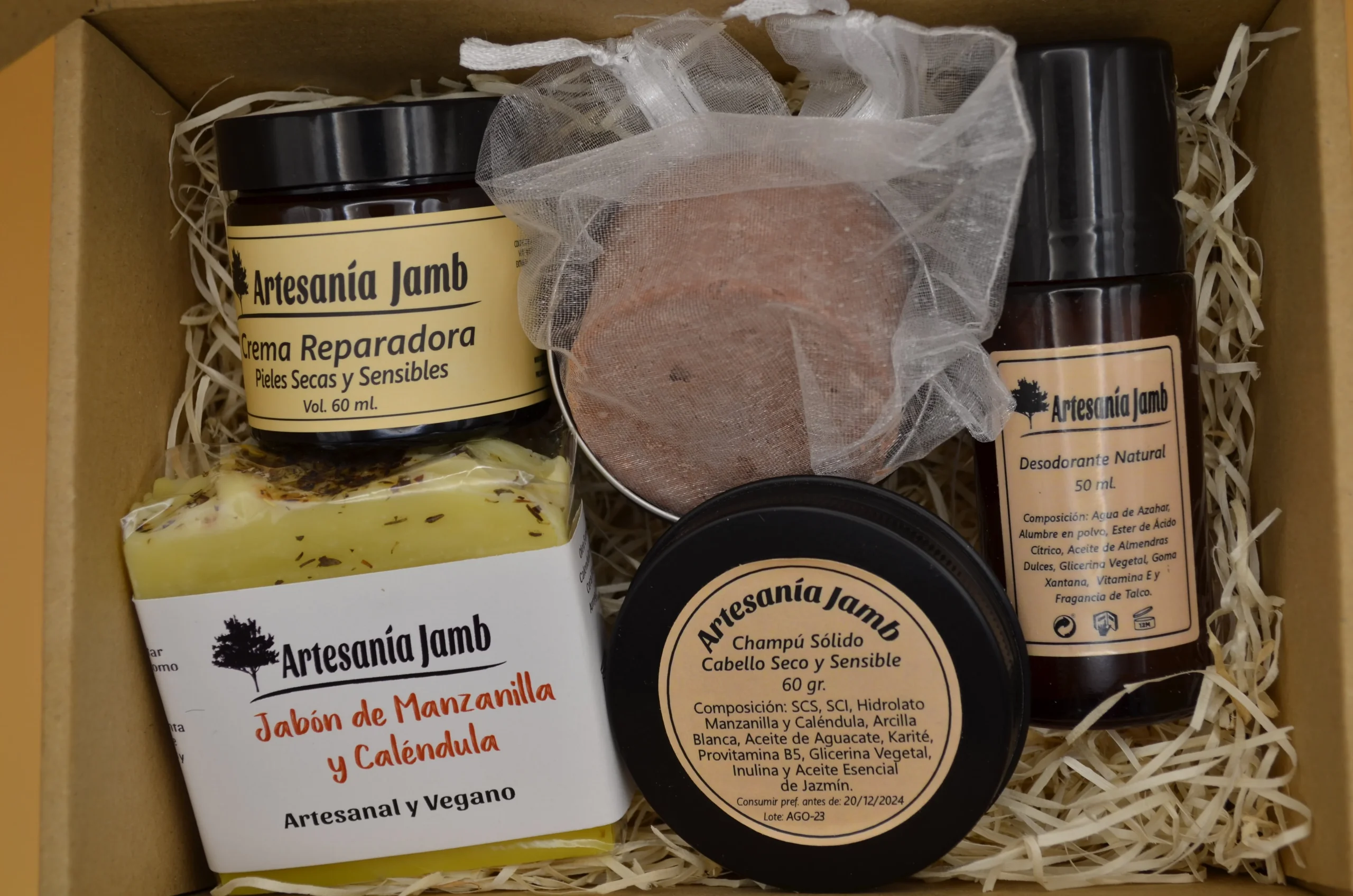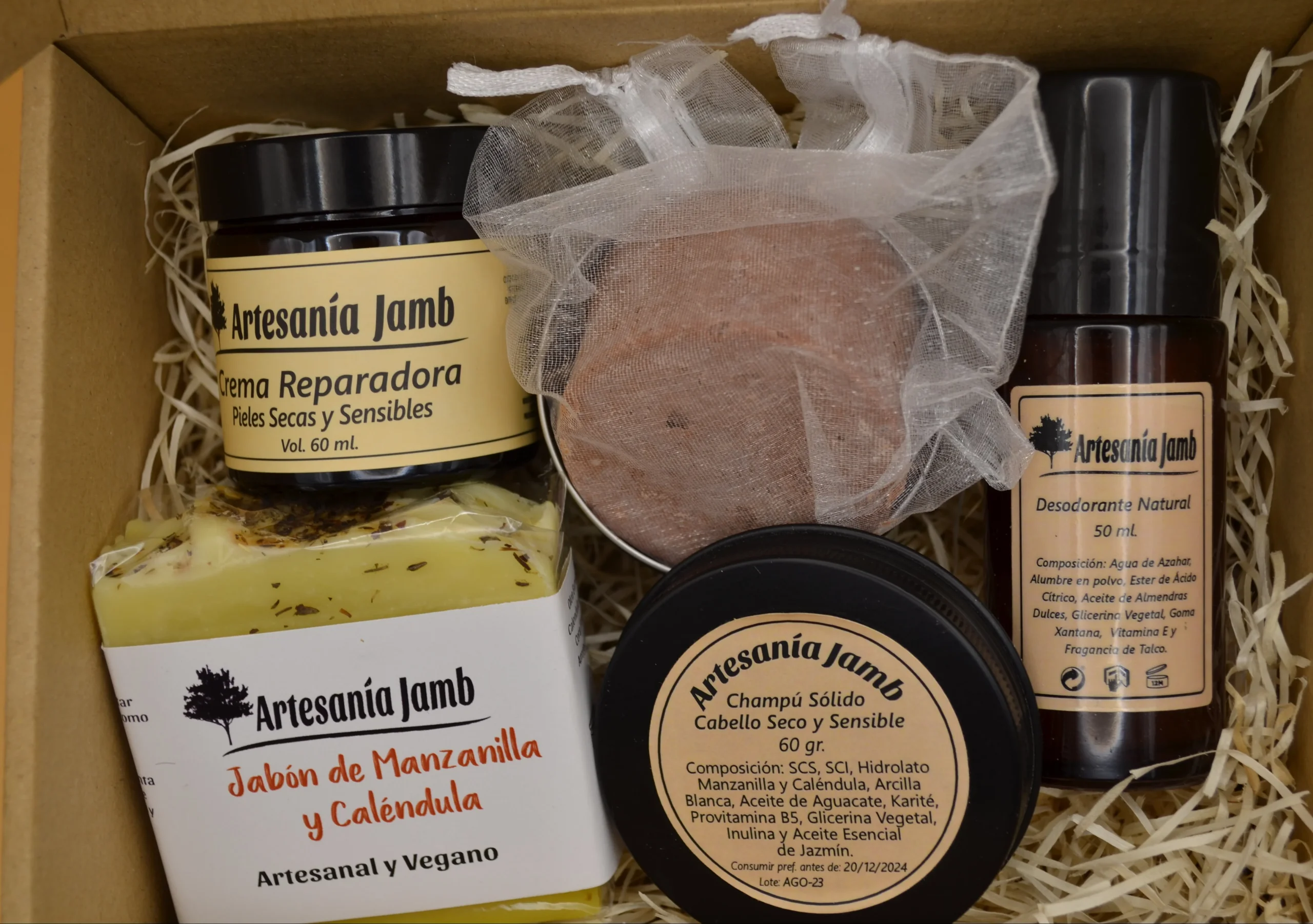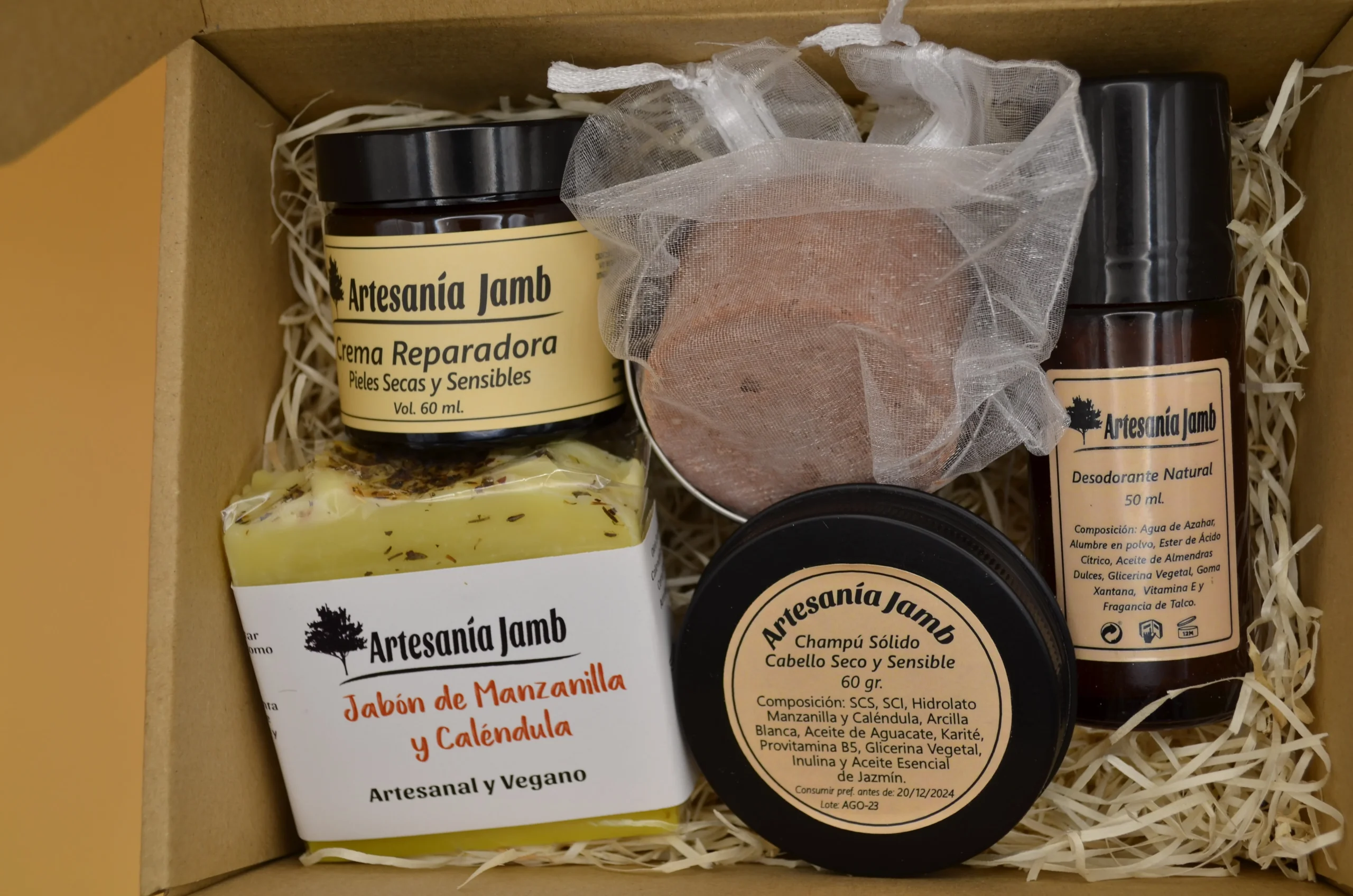 Esta Caja Regalo Piel Sensible está compuesta de los productos más nutritivos e hidratantes de Artesanía Jamb, por lo tanto está diseñada para pieles especialmente secas, sensibles y para tratar desajustes dérmicos relacionados con la escasez de humedad en la piel como dermatitis, psoriasis o eccemas. Se trata de un kit regalo súper completo ya que incluye productos para el cuidado, facial, corporal y capilar siendo todos ellos especialmente nutritivos. En primer lugar, tenemos la Crema Facial Reparadora, que recibe ese nombre por sus numerosos ingredientes calmantes, cicatrizantes y reparadores como el Aceite de Caléndula, Almendras Dulces, Karité, y Extracto de Agastache Mexicana. El Jabón Artesanal de Caléndula y el Desodorante Natural de Talco se convierten en alternativas orgánicas para el cuidado corporal y en especial para pieles irritadas o sensibles, gracias a su combinación de ingredientes reparadores, nutritivos y calmantes como Aceite de Oliva, Coco, Almendras Dulces y Karité. Por último, nuestro Champú Sólido para Cabello Seco y Sensible es un producto imprescindible que no podía faltar en este Kit y que ya se ha convertido en uno de los favoritos de nuestros clientes. Está elaborado con tensioactivos naturales derivados del Aceite de Coco, que tienen una función limpiadora; Arcillas y Aceites vegetales como Aguacate, Glicerina vegetal y Karité, con propiedades nutritivas y reparadoras; y elementos más específicos como Provitamina B5 o Inulina vegetal que aportan firmeza a la raiz y a las fibras capilares pero además actúan como acondicionadores orgánicos del cabello.