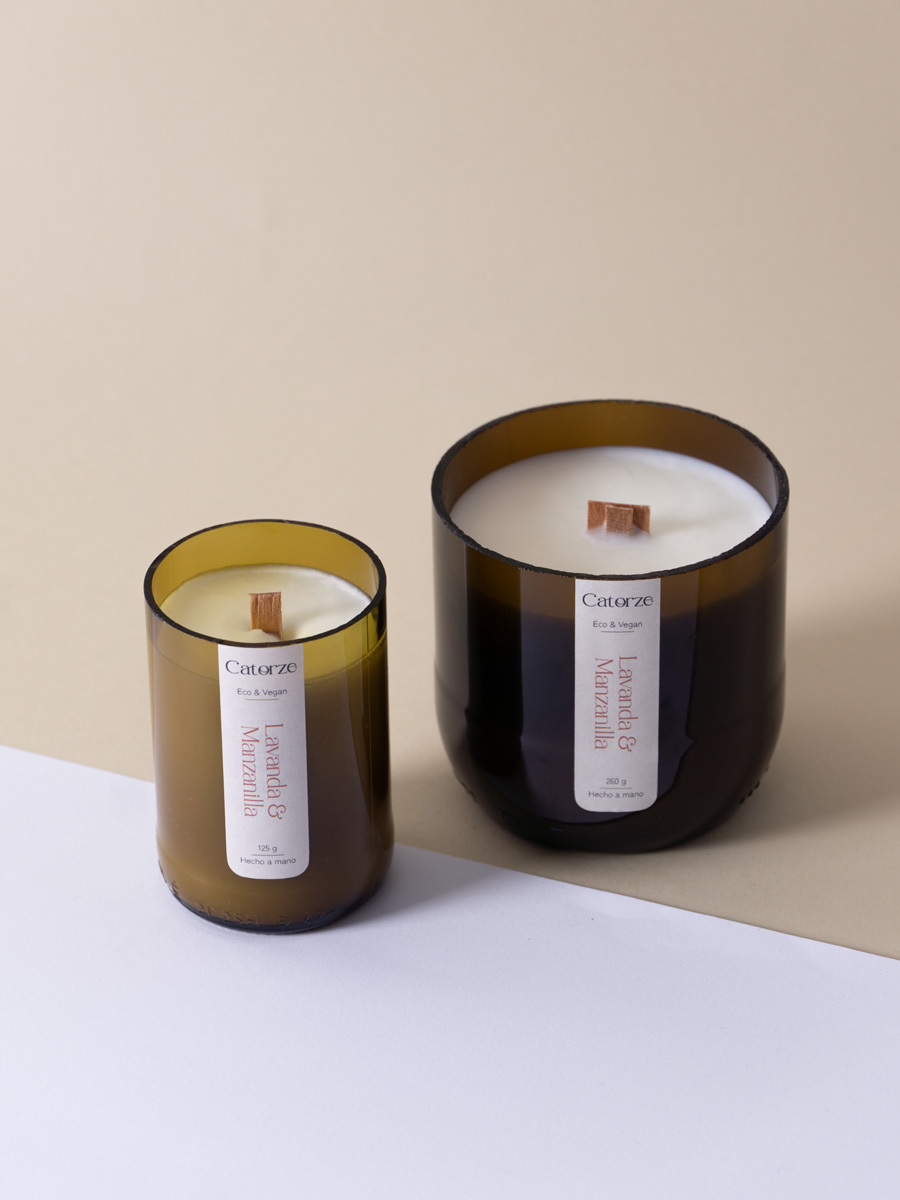 Una combinación que nos trasmite calma y serenidad, donde destaca la fragancia floral de la lavanda acompañada por la nota suave y dulce de la manzanilla. | Vela artesanal en Botellas Recicladas.