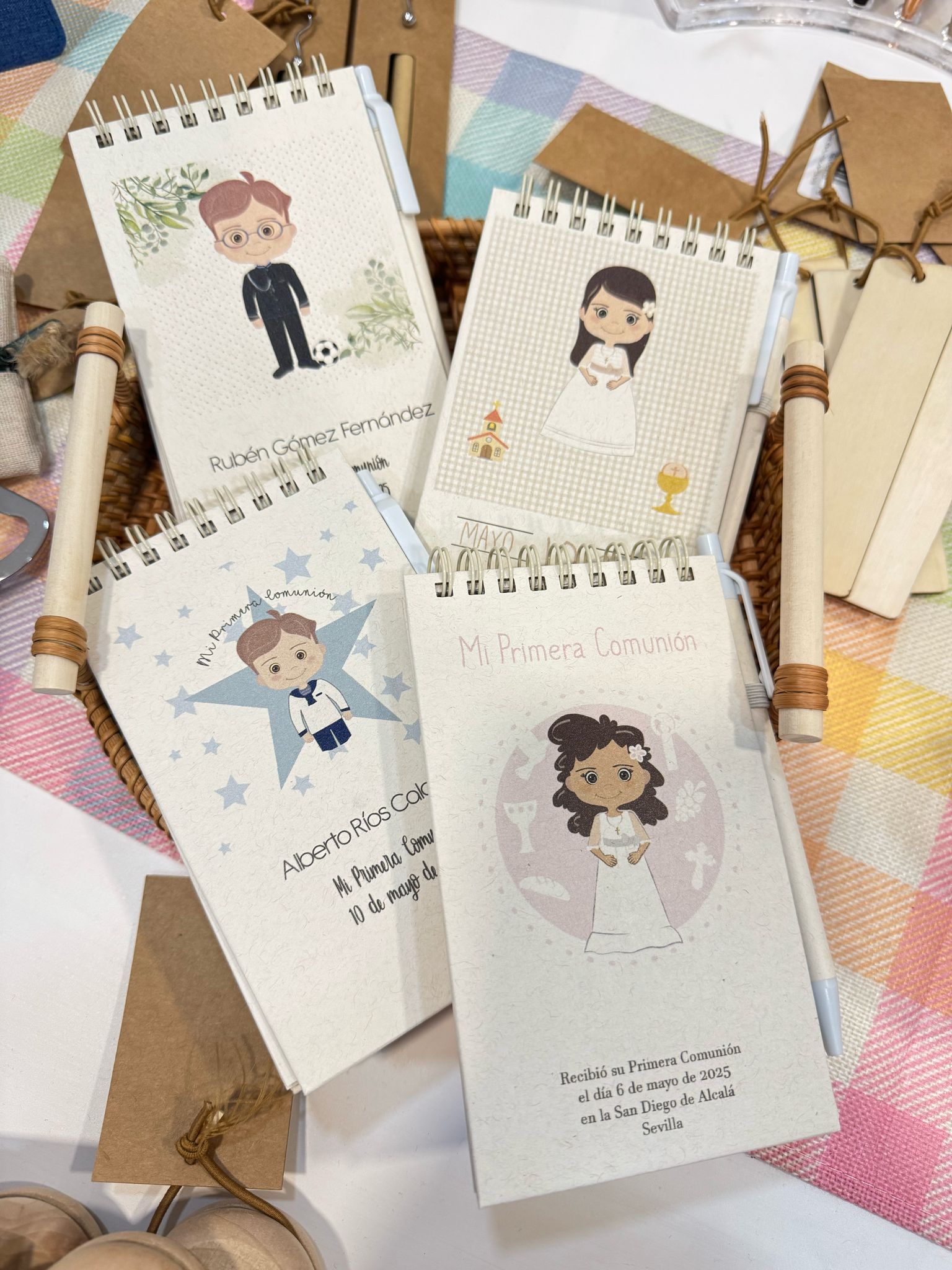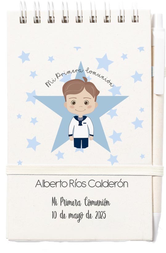 Libreta de tapas duras fabricada a partir de cartones de leche reciclados. Con 80 hojas de disposición a una raya, elástico de sujeción a juego y soporte para bolígrafo, personalizado como tú nos indiques, para regalar el día de la Comunión.