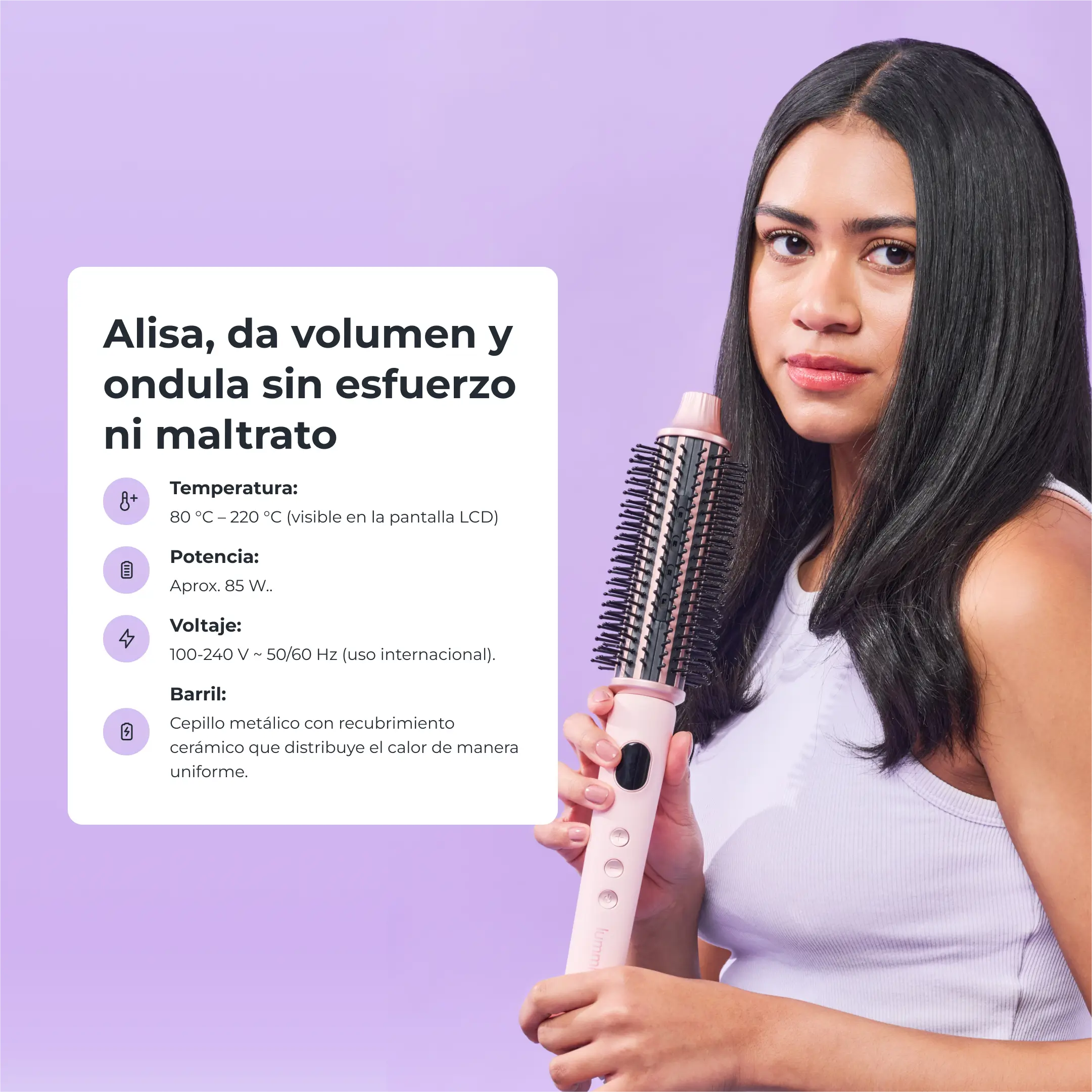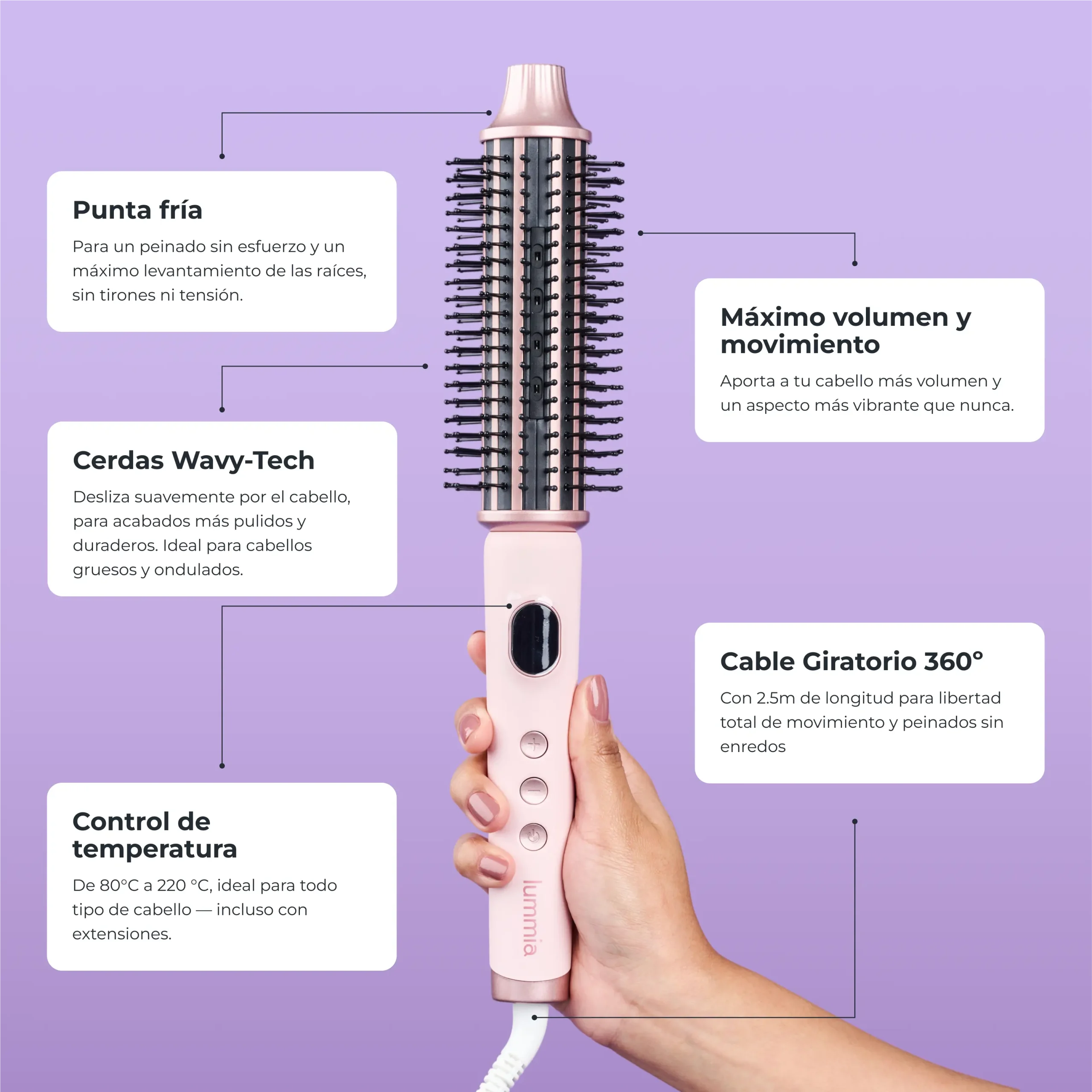 Nuestro Lumia LummiWave es un cepillo secadro 3-en-1 que combina lo mejor de un cepillo secador con calor uniforme, logrando alisados naturales, ondas tipo blowout o un liso con movimiento. Con tecnología cerámica y iónica, elimina el frizz y sella la cutícula, dejando el cabello brillante y saludable. Su diseño ergonómico y temperatura ajustable (80°C a 220°C) la hace ideal para todo tipo de cabello. ¡Disfruta de un acabado profesional desde la comodidad de tu hogar!