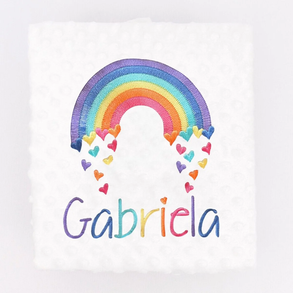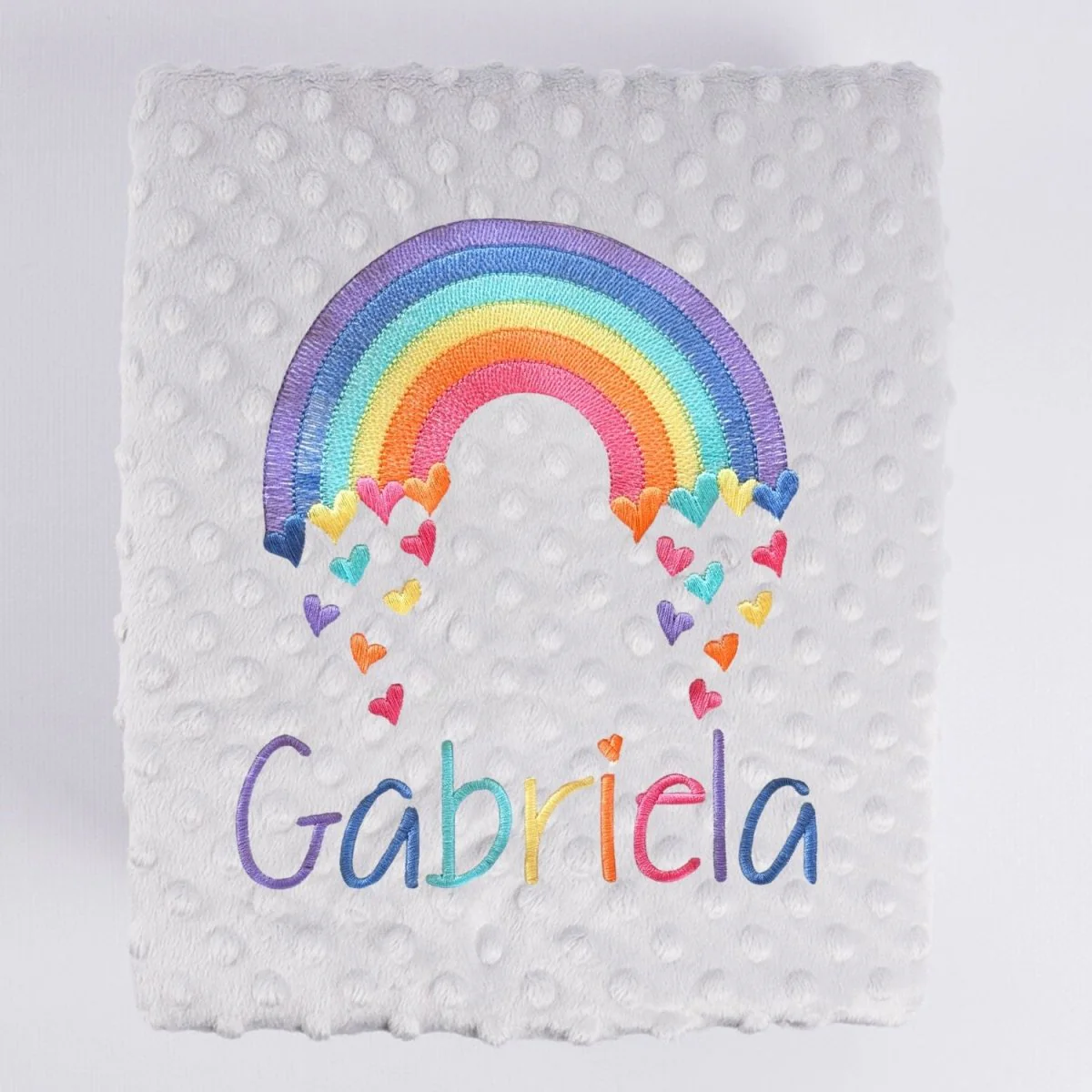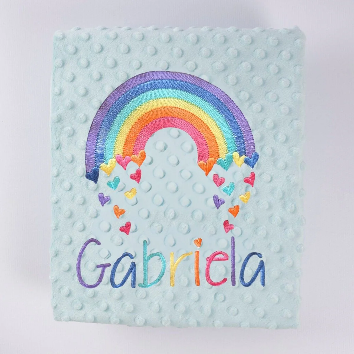Manta bebe con el nombre del bebé bordado y arco iris.